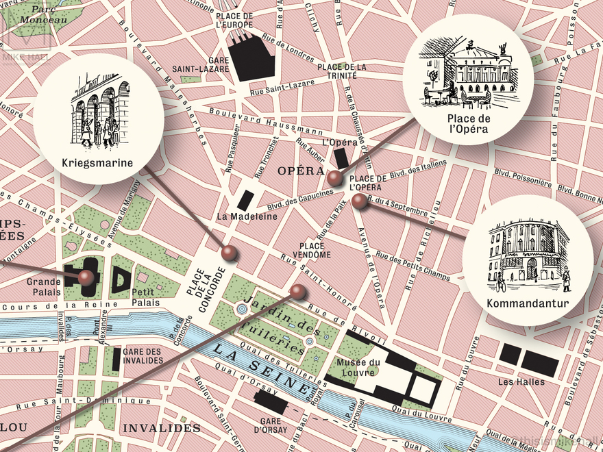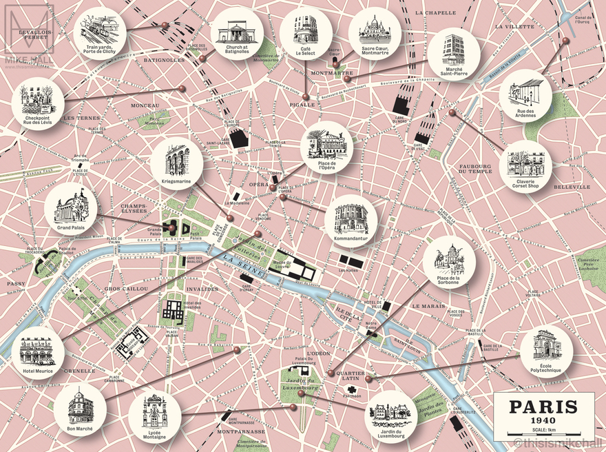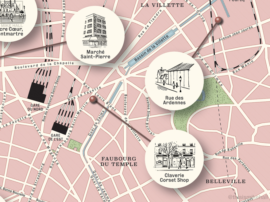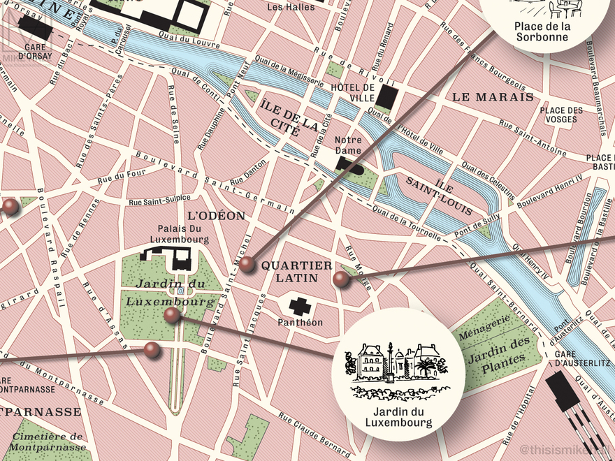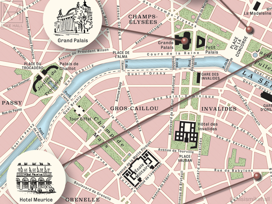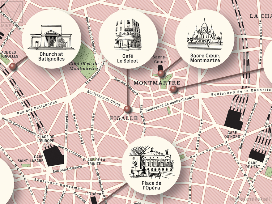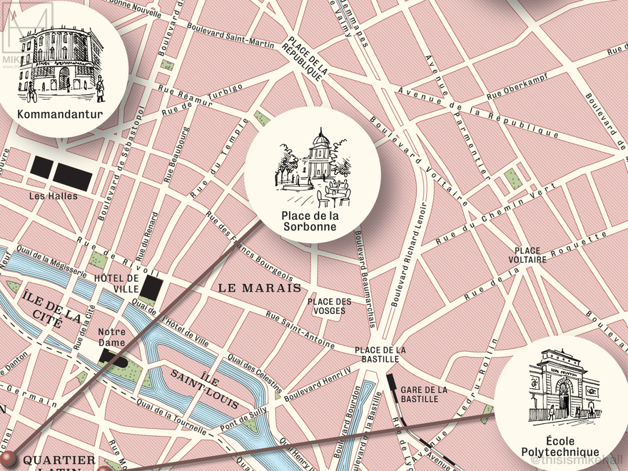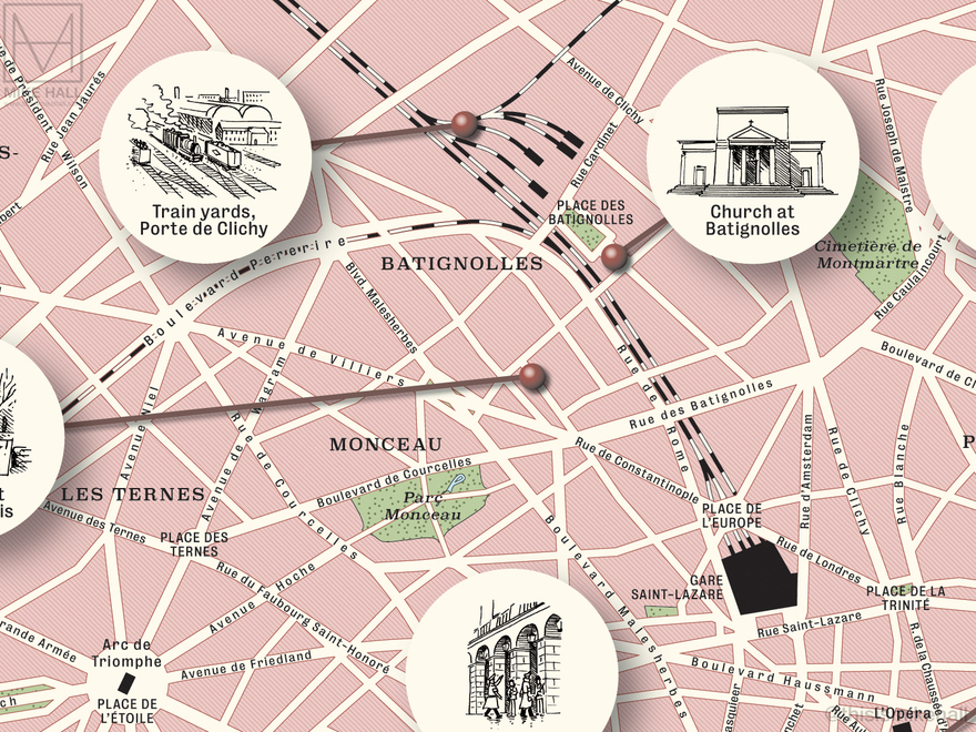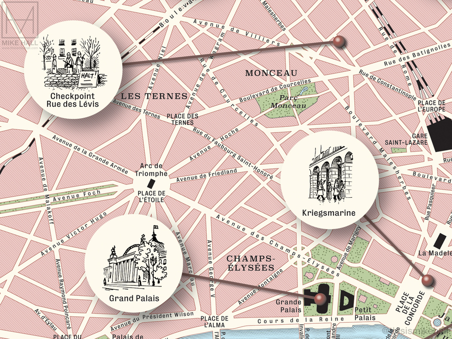 I was commissioned by the publishers Soho Press to create this illustrated period-style map of Paris for the endpapers of the novel Three Hours In Paris by Cara Black (published in April 2020), a thriller set in the French capital during the Nazi occupation in World War II. The map displays eighteen locations around the city that are key to the plot, each illustrated by simple pen sketches, as well as famous landmarks. The brief required the design to resemble tourist guide maps of the 1930s-1940s. To achieve this, I used a limited colour palette and period-style typefaces for the text labels (Brandon Grotesque and Clarendon); I was also careful to ensure that the detail was correct for the period, researching plans of Paris from the 1930s and omitting any modern-day details or landmarks that didn't exist until later, such as the Périphérique orbital motorway. As a further illustrative touch and to relate to the theme of the story, I had the idea of creating the illusion of pins and string connecting to the illustration bubbles, in the manner of maps created by detectives in their investigations.