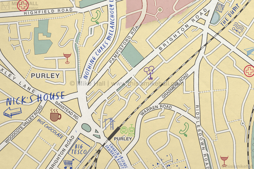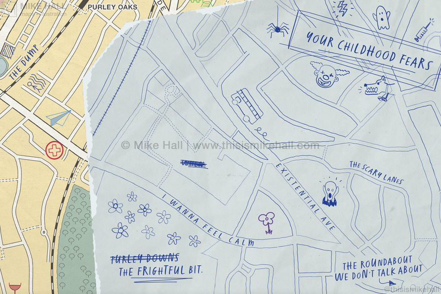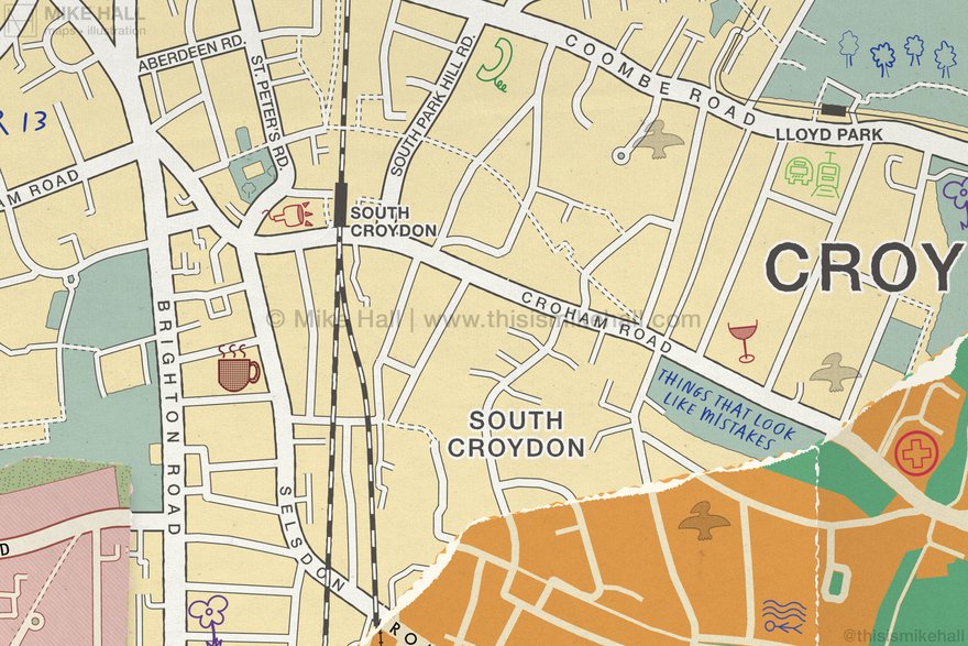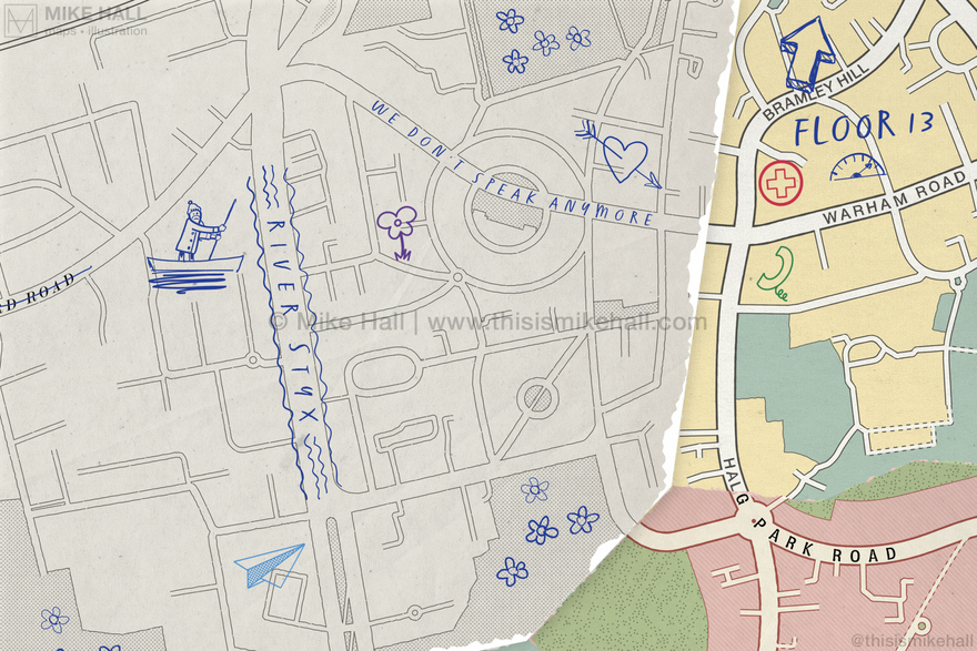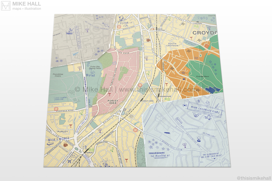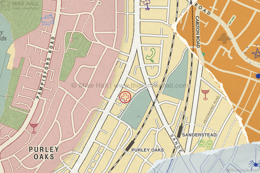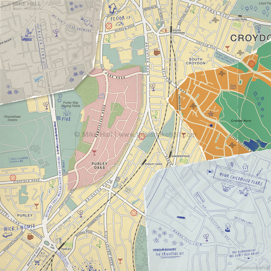 The English indie rock band Bears In Trees commissioned me to create the cover artwork for their 2024 album, How To Build An Ocean: Instructions. Inspired by the band members' home town of Croydon, south London and their enthusiasm in cartography, the artwork replicates a collage of different map styles pasted together with handwritten notes, doodles and symbols representing songs on the albums on top.