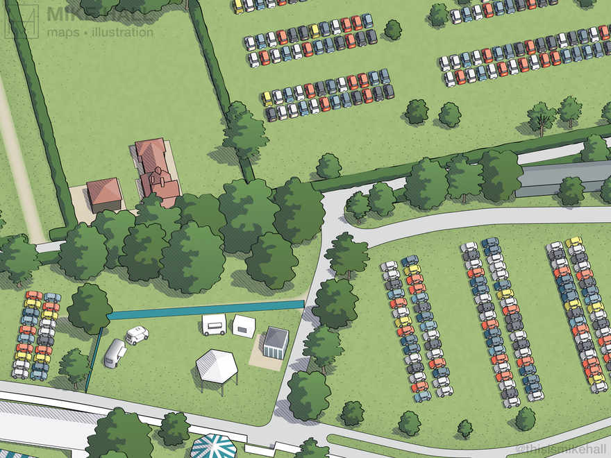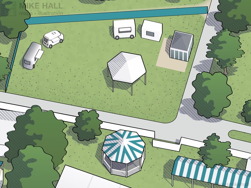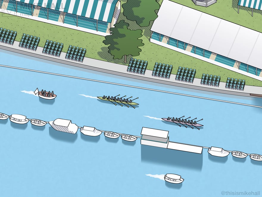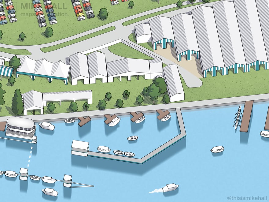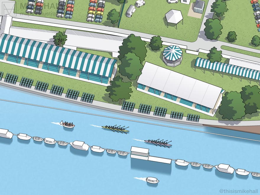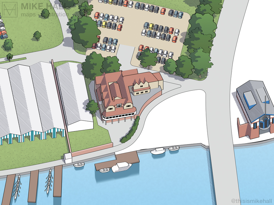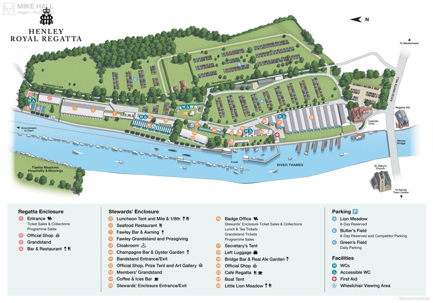This visitor map was originally commissioned by the organisers of the annual Henley Royal Regatta in Henley-on-Thames, Oxfordshire, United Kingdom for their 2023 event and has been used again, with some modifications, for their 2024 and 2025 events. It shows a birds' eye view of the entire event site, including spectator grandstands, boating sheds, car parking and other amenities, and part of the rowing course along the River Thames.