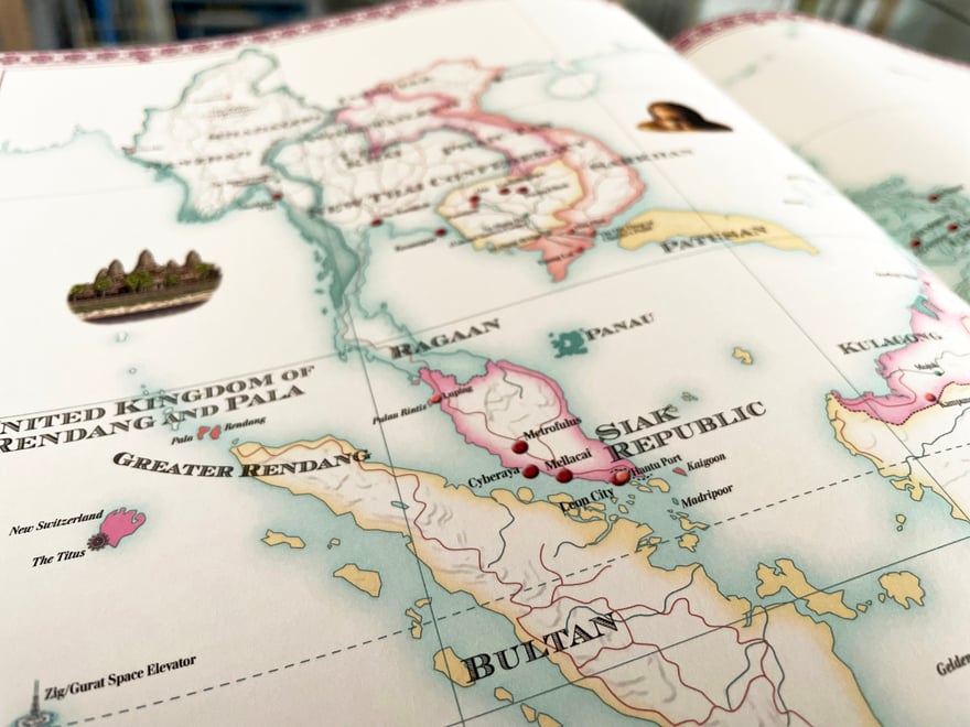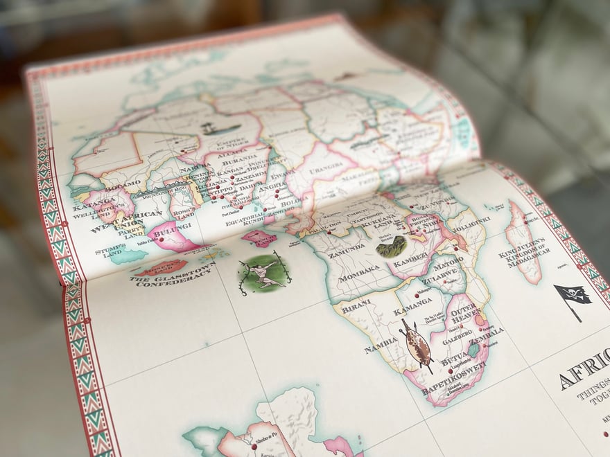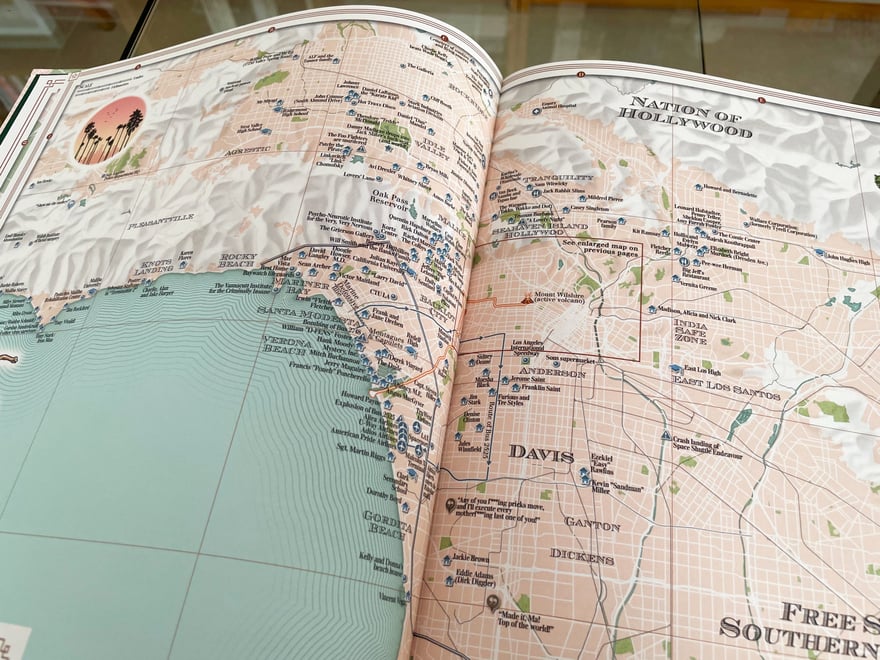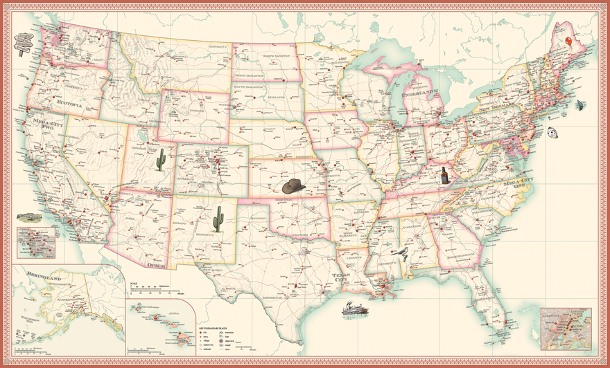 The full design for the map of the United States in Atlas of Imagined Places, which is divided into three sections (east, central and west) for the book.