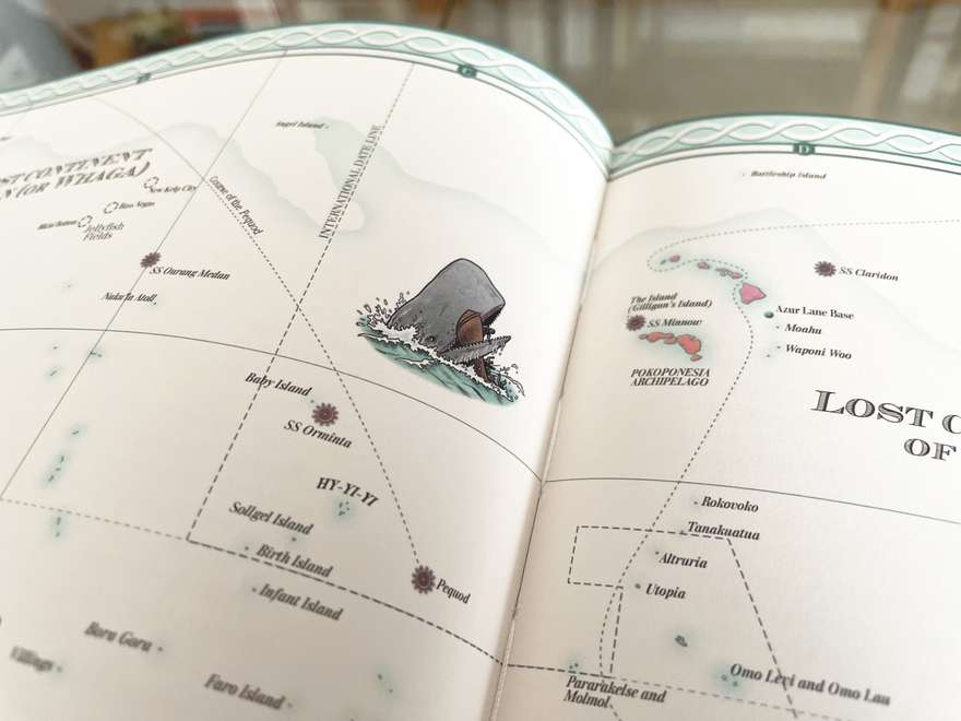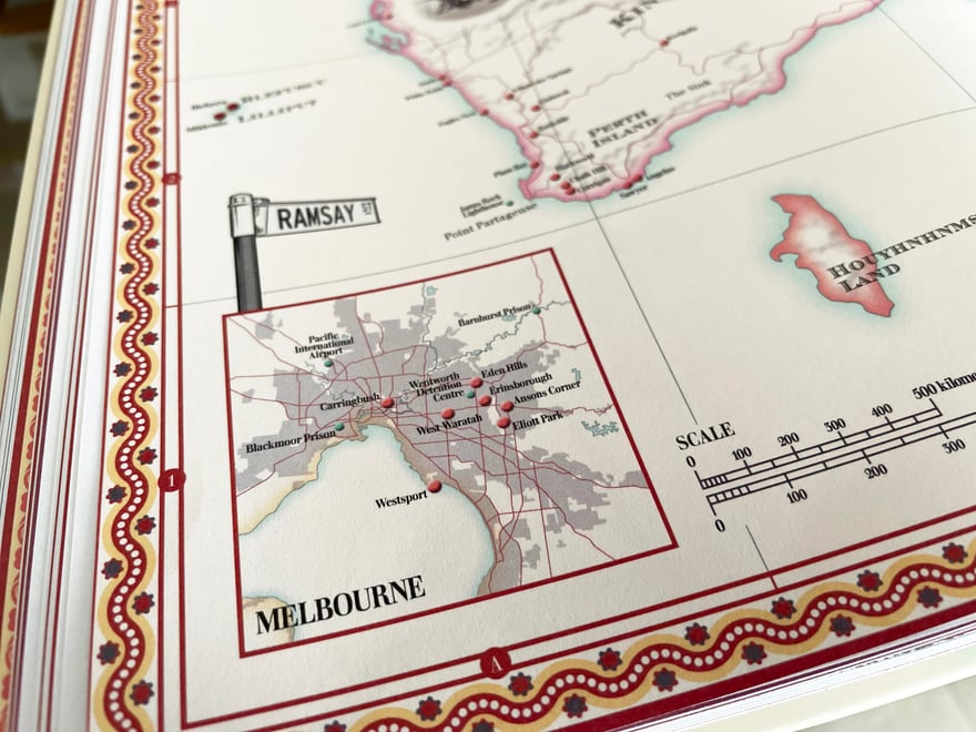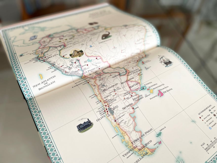 Several maps in Atlas of Imagined Places include details of large cities, such as this map of Melbourne set in the corner of the map of Australia and New Zealand.