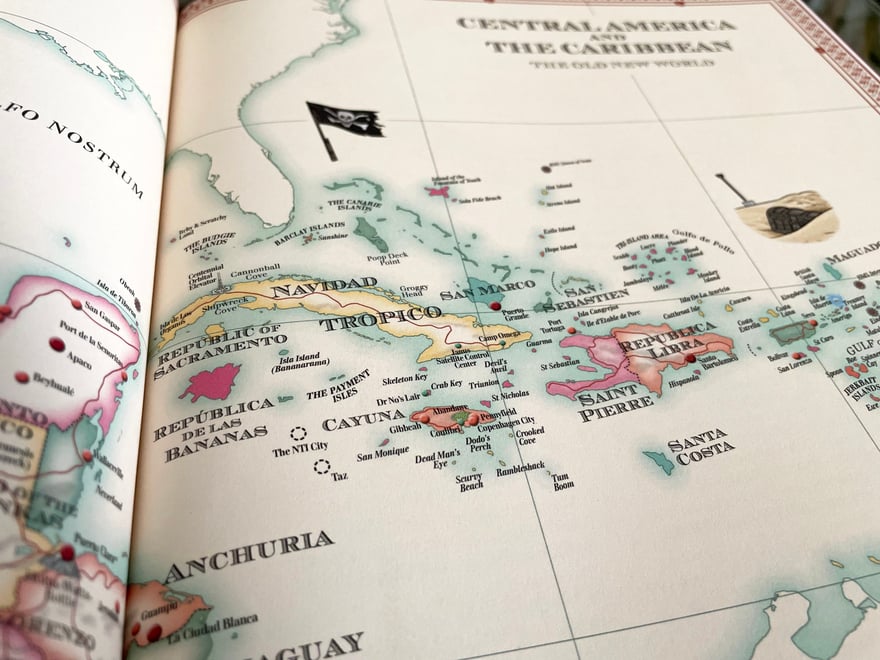 Detail from the map of Central America and the Caribbean from Atlas of Imagined Places, which features many small fictional islands alongside the real ones.