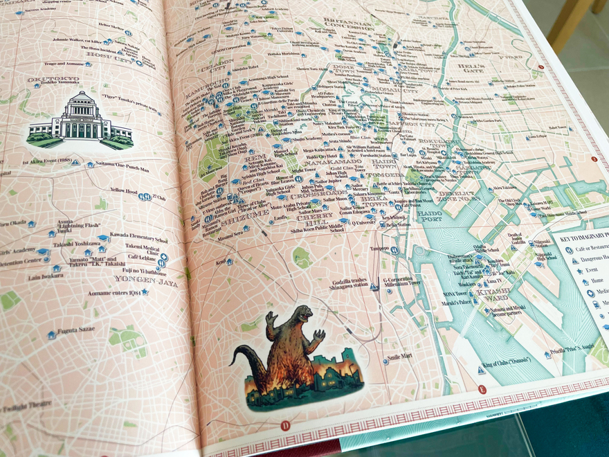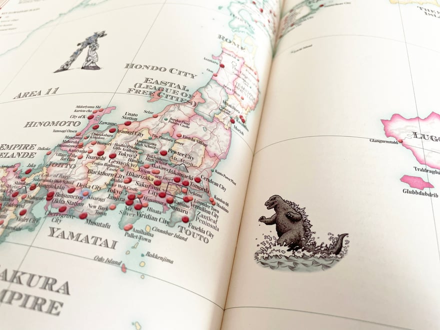 Detail from the map of Japan from Atlas of Imagined Places, one of my favourite maps to draw. Here can be seen an illustration of the monster Godzilla (or Gojira), emerging from the sea to attack Tokyo.