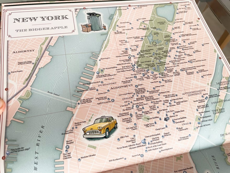 Detail of the map of New York from Atlas of Imagined Cities. Other cities featured in the title are Washington DC, Los Angeles, Miami, Chicago, San Francisco, New Orleans, Paris, Berlin, London, Venice, Sydney, Rio de Janeiro and Tokyo.
