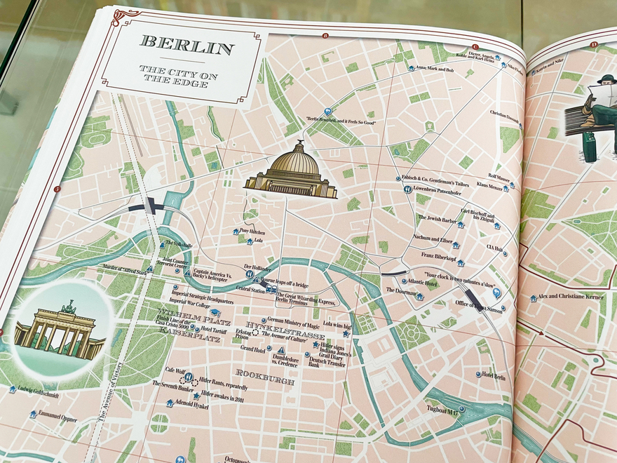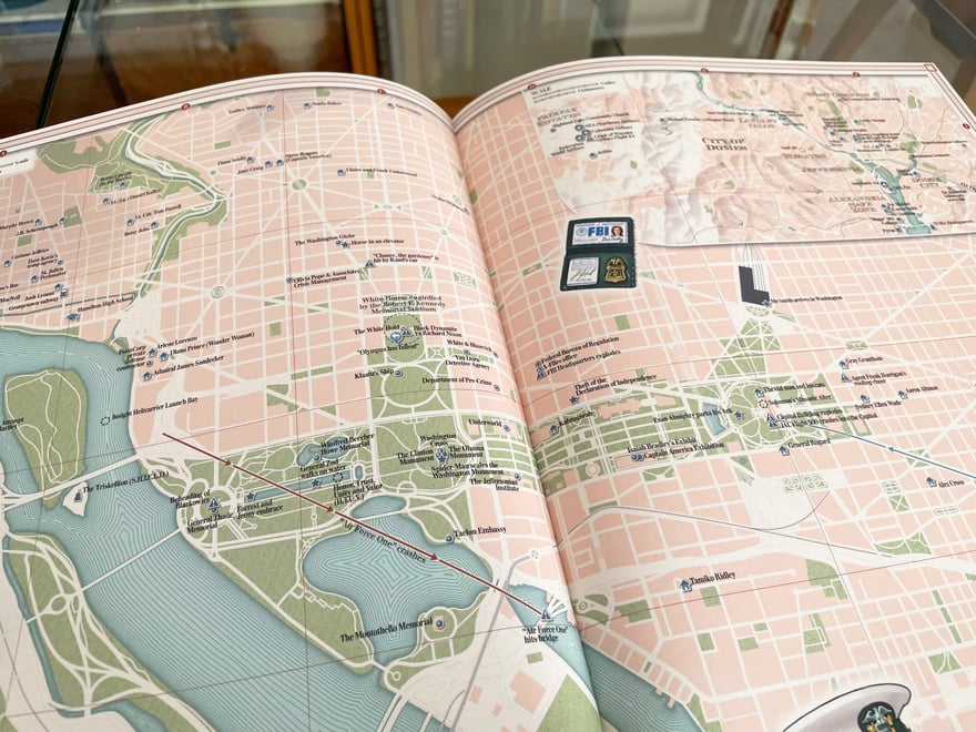 Detail of the map of Washington, DC from Atlas of Imagined Cities. Many locations in this map relate to both real and fictional federal and governmental buildings in the city.