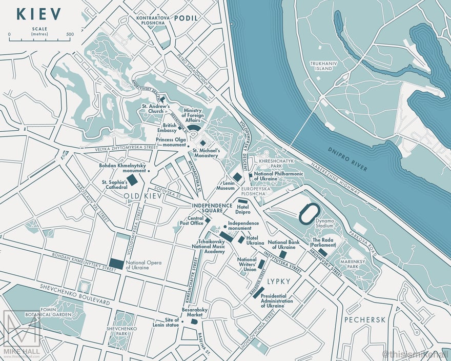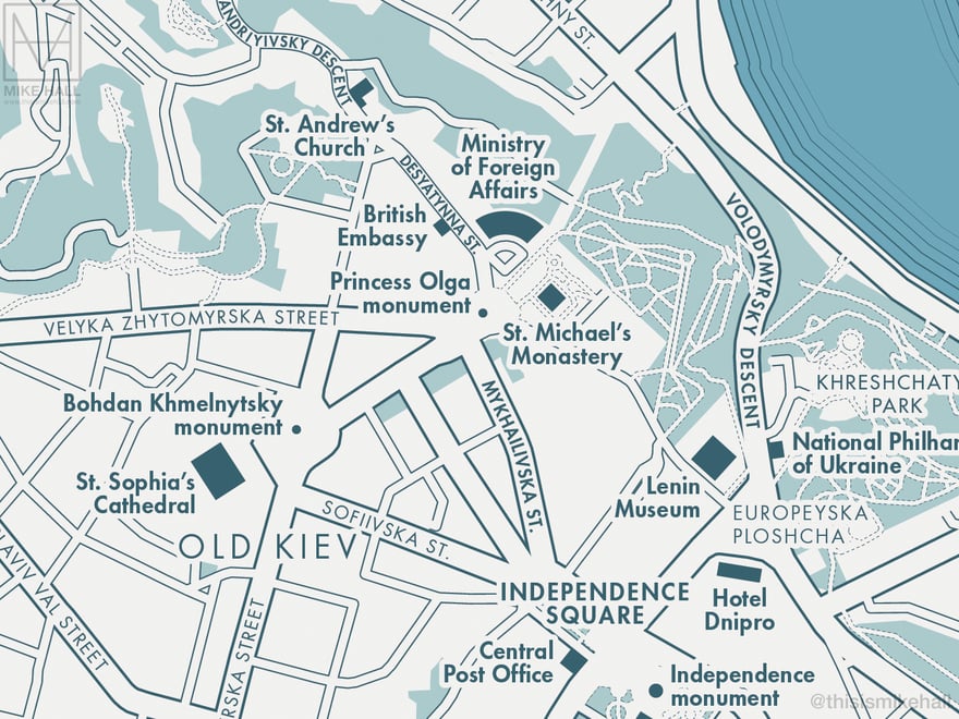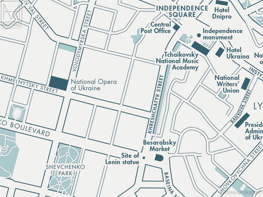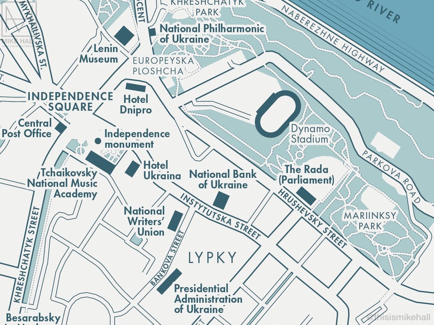 I was commissioned by the publishers Penguin Random House to create this endpaper map of the Ukrainian capital Kyiv for the novel "Independence Square" by A. D. Miller (published in February 2020 by their imprint Harvill Secker), a thriller partly set during the events of the Orange Revolution in 2004. The map aides readers' understanding of the city's layout by displaying locations mentioned in the narrative and where important plot details take place.