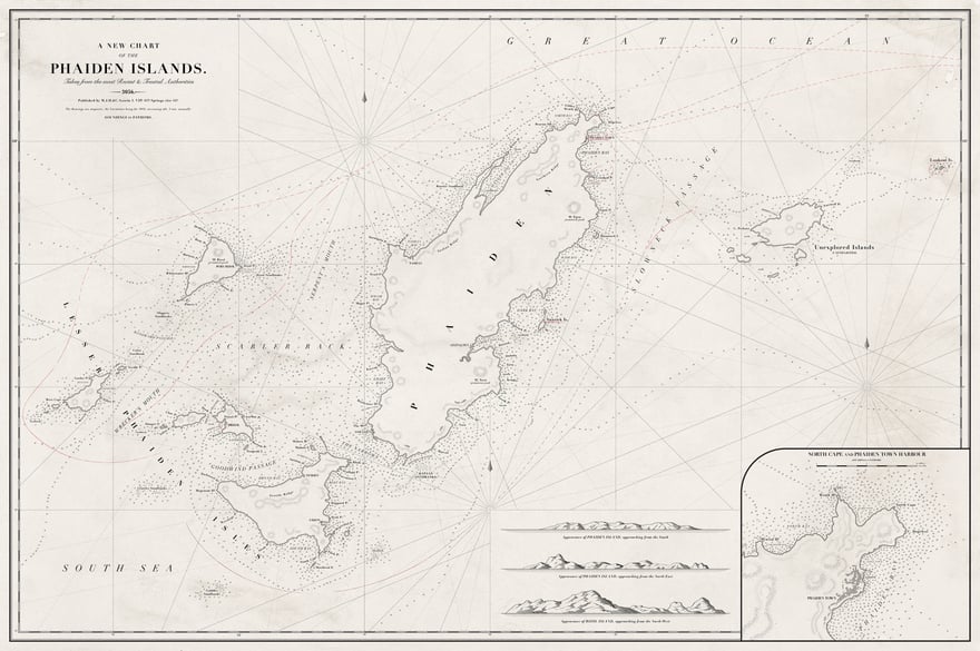 Another common element of charts from the period were illustrated views of the coastline from different directions that showed prominent peaks and coastline features. This was added to further enhance the authentic look of the chart.