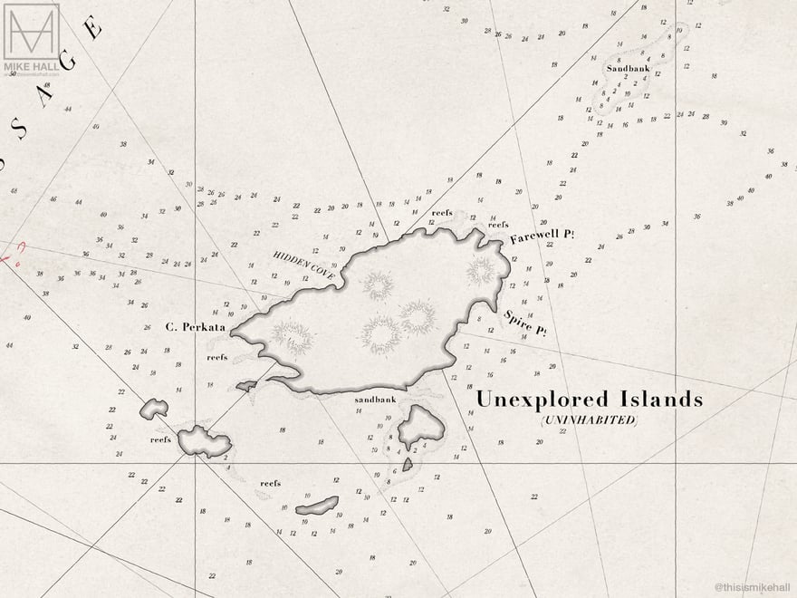 An archipelago of uninhabited islands. This section of the map was required to be high in detail as it would feature in a close-up shot in which the main character points at it. The animation team provided me with specifications of its precise position.