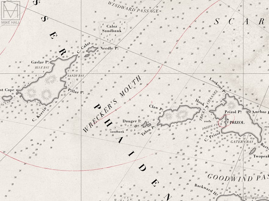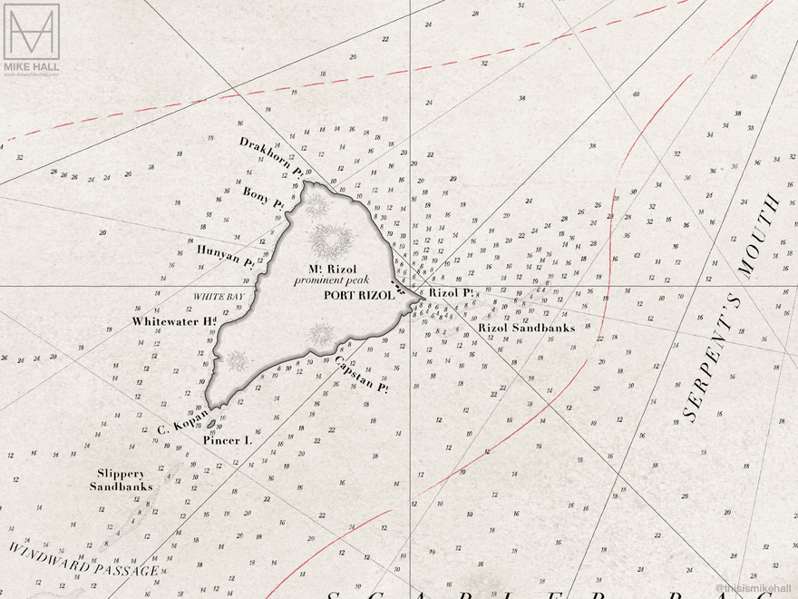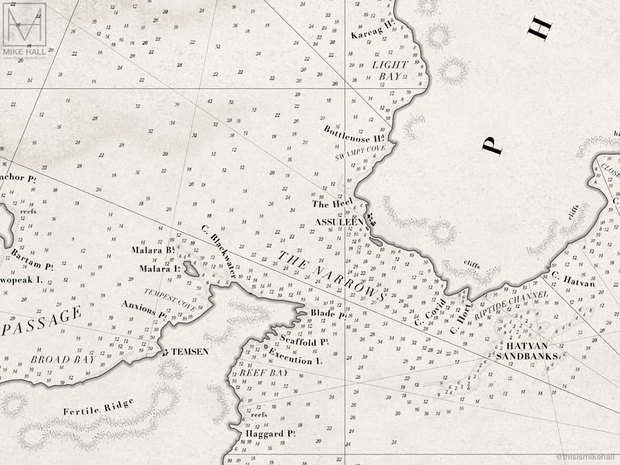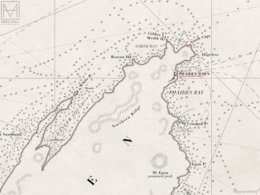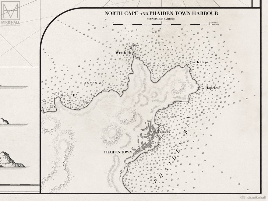 Headland labels, settlements and depth measurements, terrain hachures and coastal shading were all inspired by real-life charts of the period.