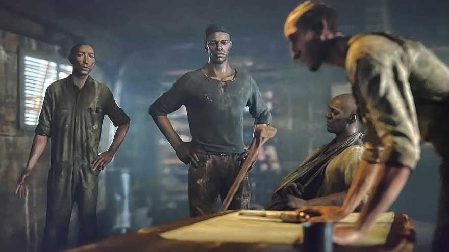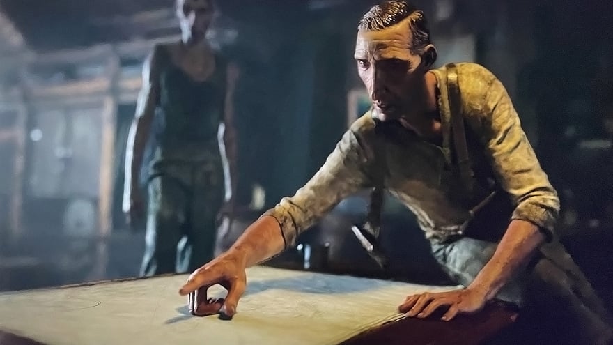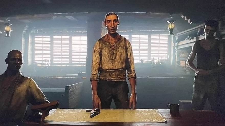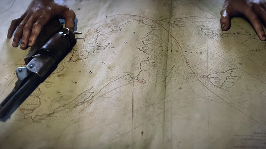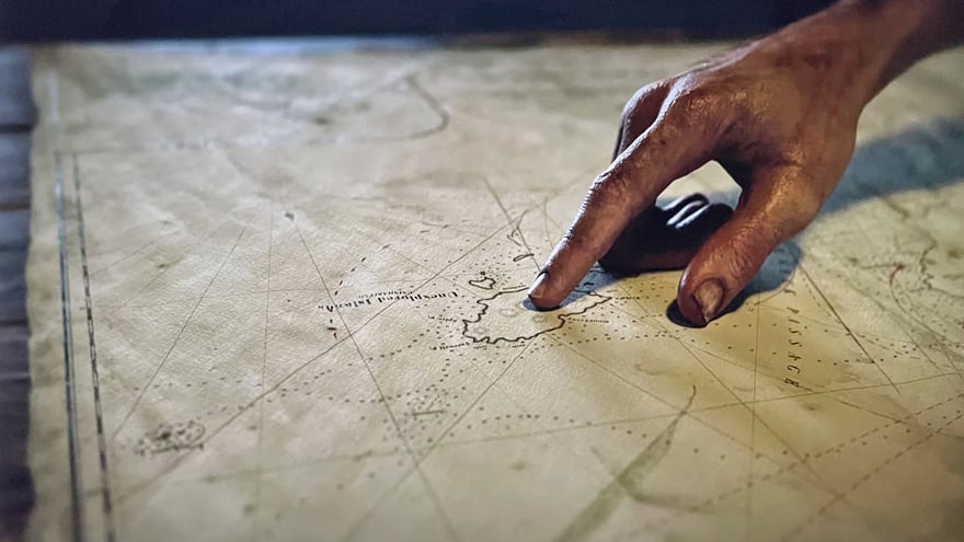 The scene at 00:08:25 in which the ship's captain Torrin (voiced by Troy Baker) unfurls the chart onto a tabletop and proposes to his crew that they sail to a group of uninhabited islands near Phaiden where they intend to safely deposit the creature on board their ship (image © Netflix).