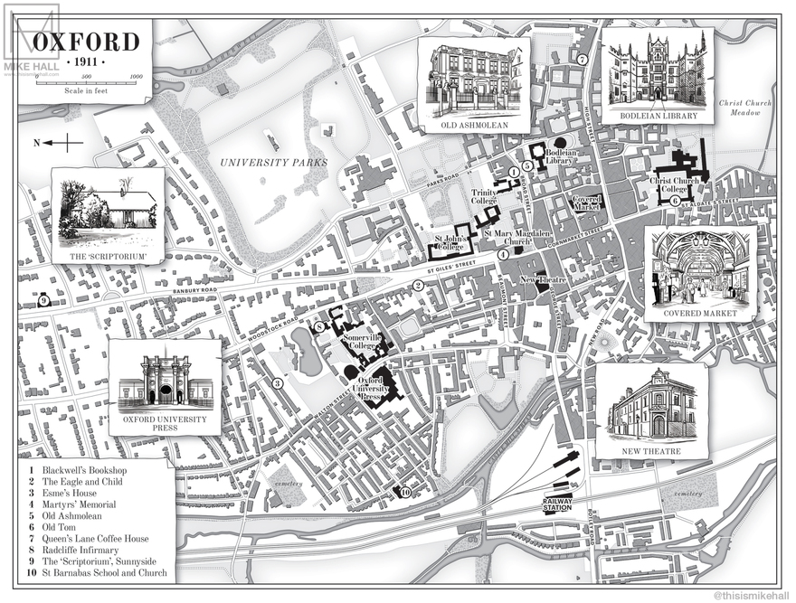 I was commissioned by the publishing group Penguin Random House to create this illustrated period-style map of Oxford for The Dictionary of Lost Words by Pip Williams (ISBN 9780593160190, published in April 2021), a novel set within the famous university city in 1911. The map displays locations and landmarks around the city that are key to the plot, with six of the most important illustrated with simple pen sketches. The brief required the design to authentically resemble a map of the period and accurately show the city's streets and buildings as they were at the time; to achieve this I referred to contemporary Ordnance Survey maps of Oxford and used an appropriate typeface and a black and white colour scheme.