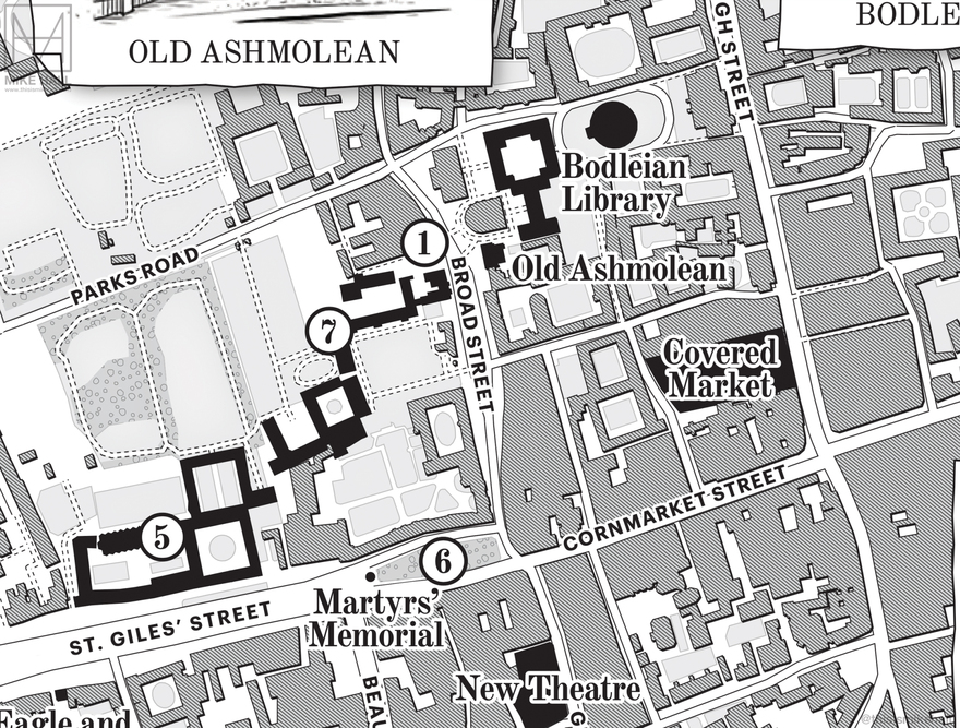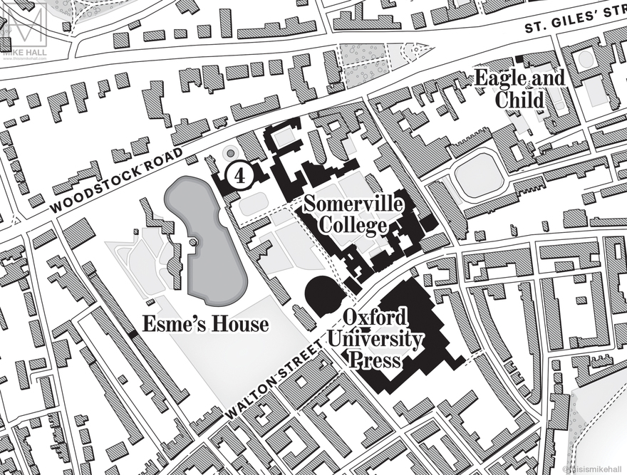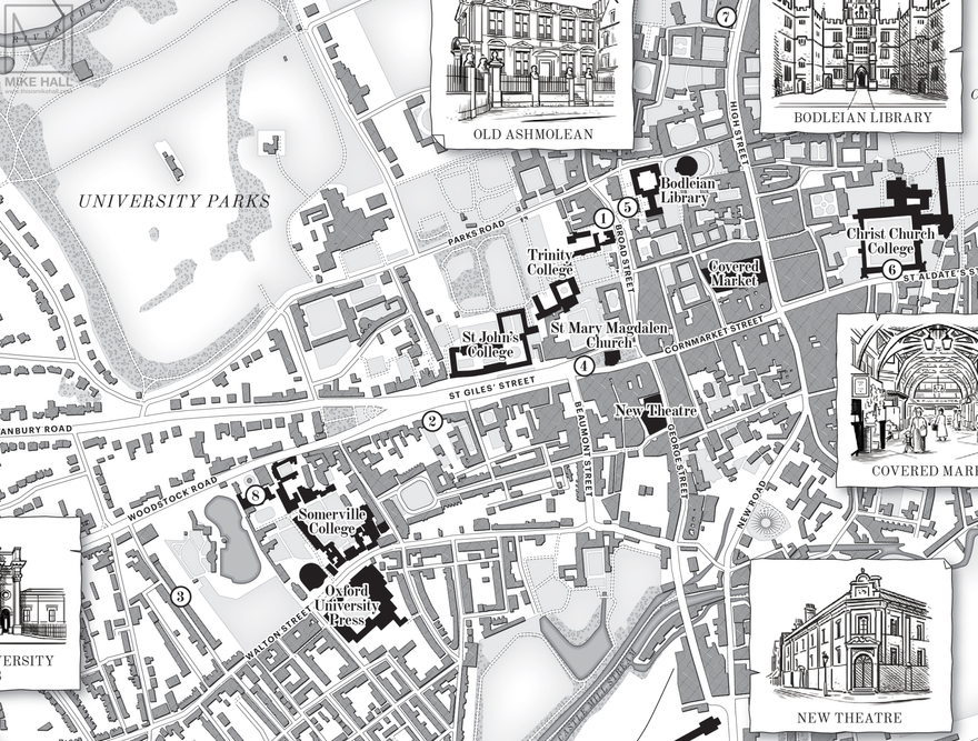 Detail of some of the key buildings in the map including Somerville College as it appeared at the time, and the nearby Oxford University Press building on Walton Street.