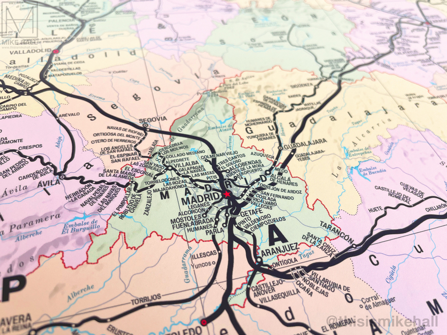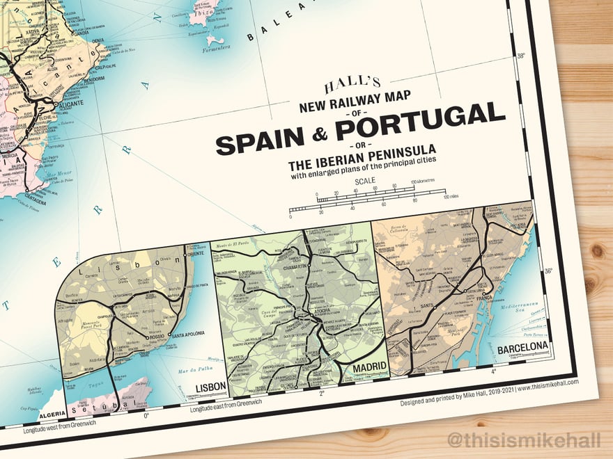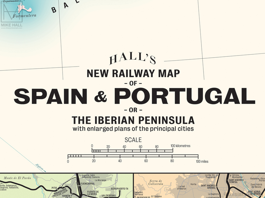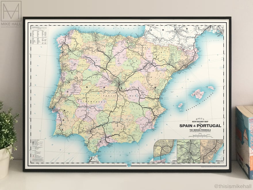 These detailed maps of the modern-day railway networks in Great Britain, Greater London and the Iberian Peninsula take their inspiration from vintage railway maps of the late 19th and early 20th centuries. All railways are represented by solid black lines, with stations marked with dots or circles; larger circles generally represent larger cities or important interchanges.