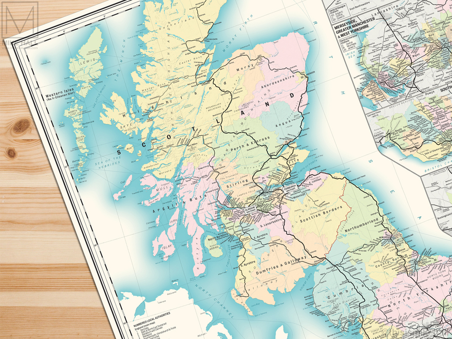The design includes enlarged details of eight metropolitan areas: Glasgow, Edinburgh, Merseyside, Greater Manchester, West Yorkshire, South Wales, Birmingham and Greater London.