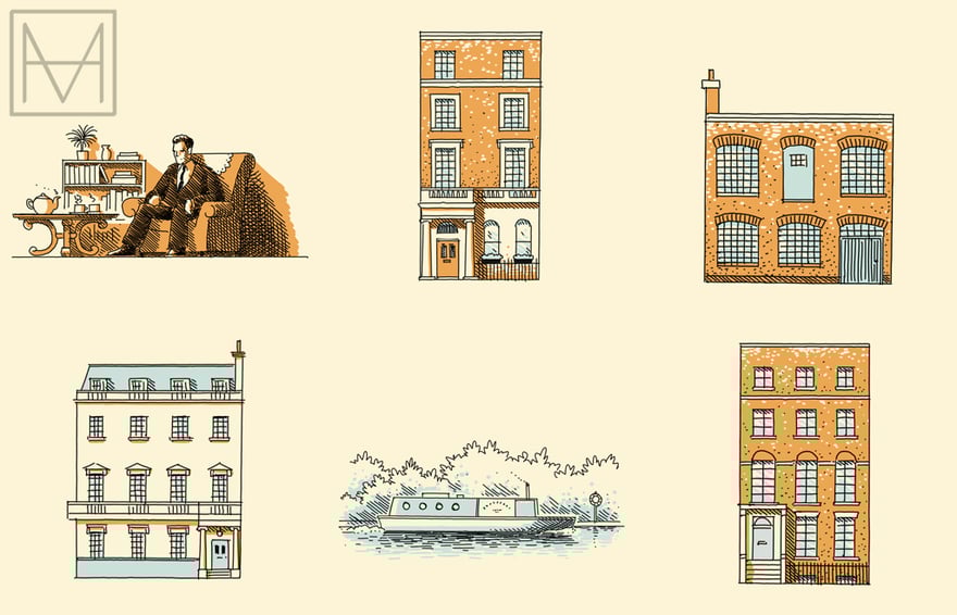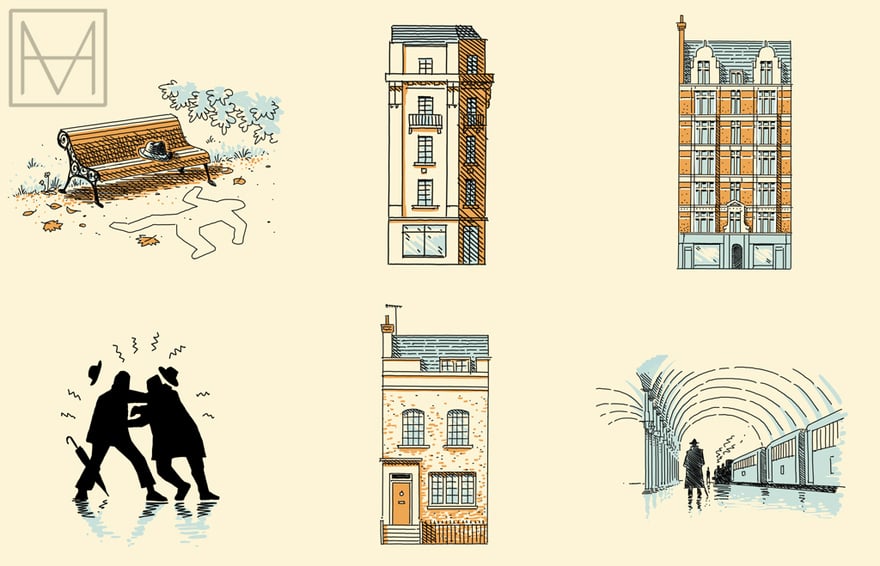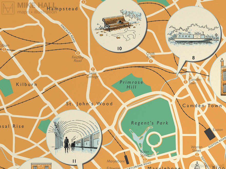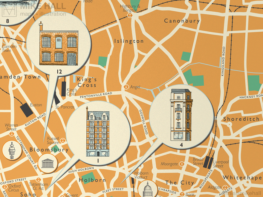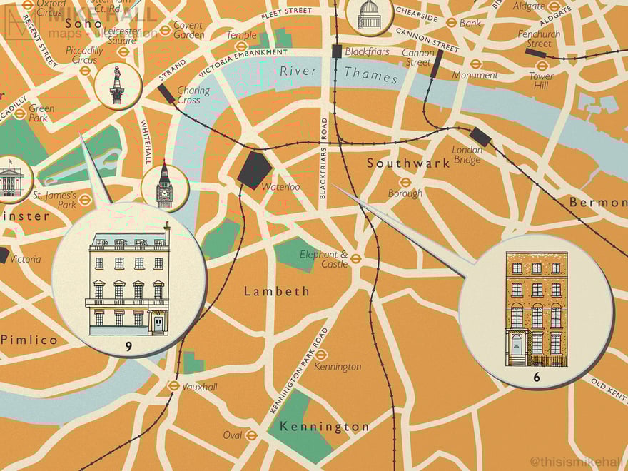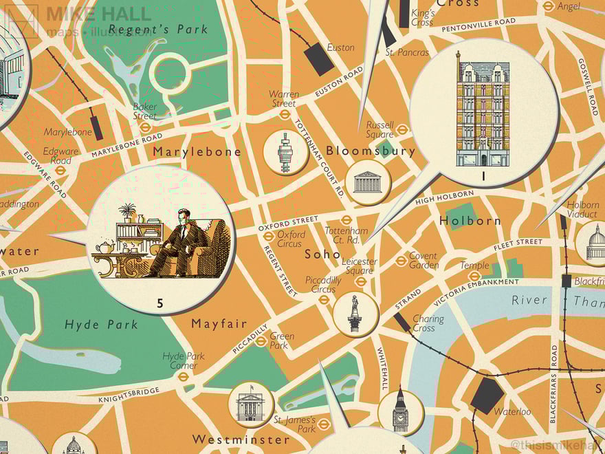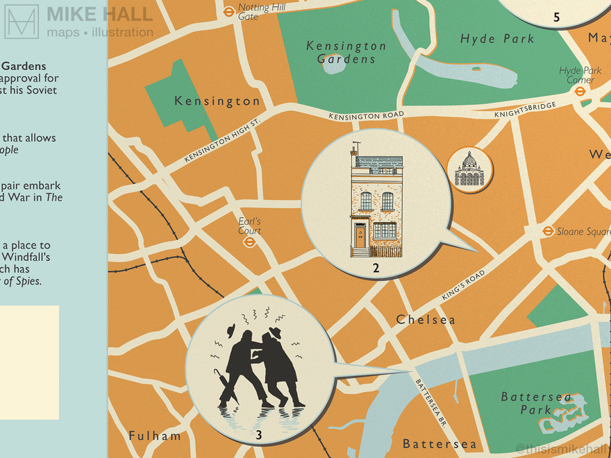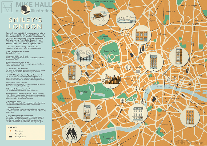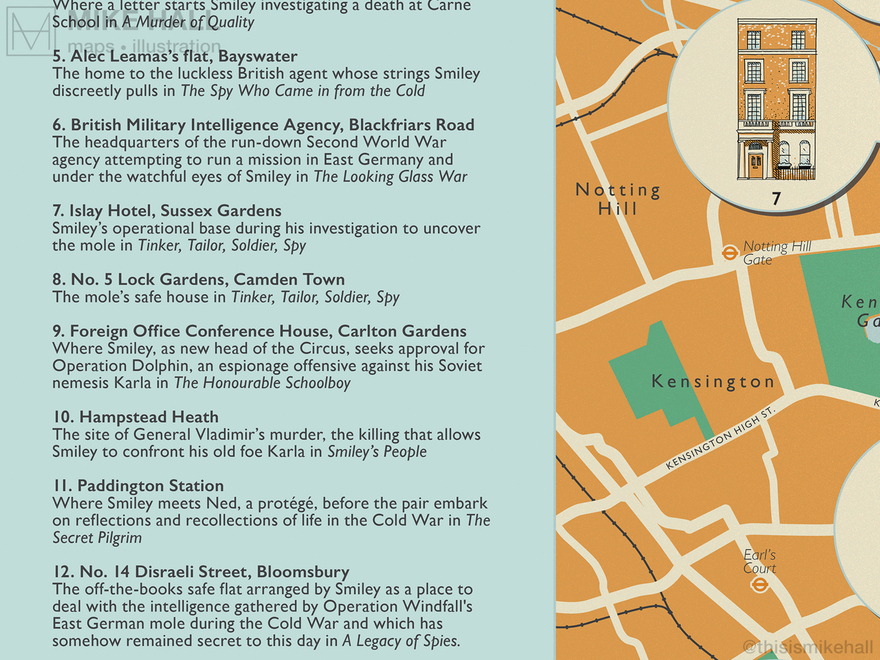 Illustrated scenes and locations (clockwise from top left): Alec Leamas's flat in Bayswater, featured in The Spy Who Came in from the Cold; Islay Hotel in Sussex Gardens, featured in Tinker, Tailor, Soldier, Spy; no.14 Disraeli Street in Bloomsbury, the safe house featured in A Legacy of Spies; the British Military Intelligence Agency headquarters in Blackfriars Road, featured in The Looking Glass War; no. 5 Lock Gardens in Camden Town, the mole’s safe house in Tinker, Tailor, Soldier, Spy; and the Foreign Office Conference House in Carlton Gardens, featured in The Honourable Schoolboy.