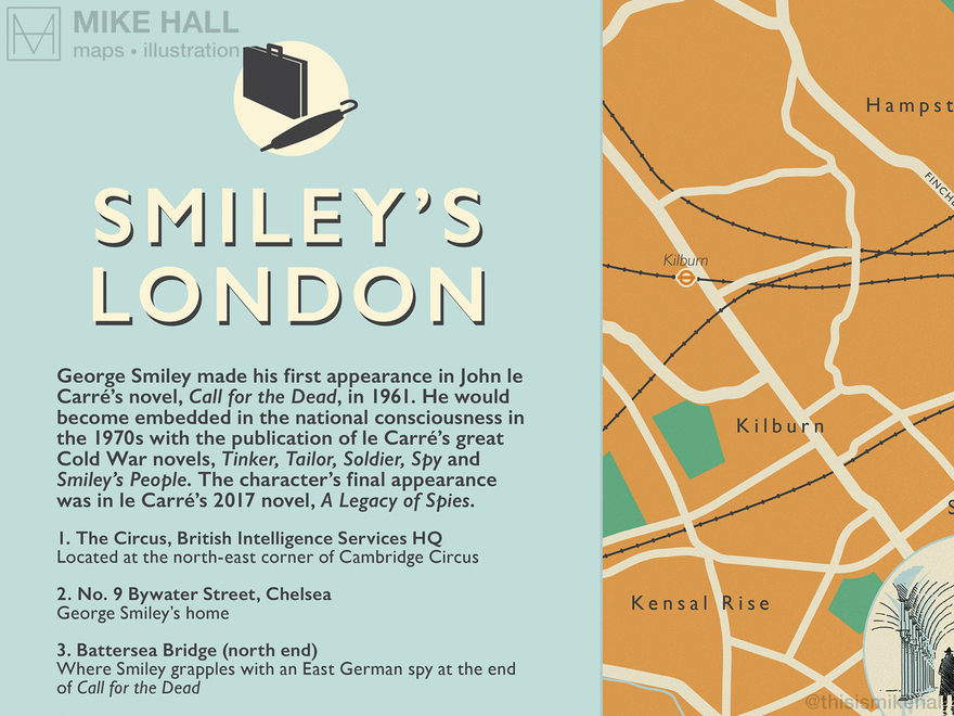 Illustrated scenes and locations (clockwise from top left): Hampstead Heath, site of General Vladimir’s murder in Smiley’s People; the Unipress Building in Fleet Street, featured in A Murder of Quality; The Circus, British Intelligence Services HQ located at the north-east corner of Cambridge Circus; Paddington Station where Smiley meets his protégé Ned in The Secret Pilgrim; no.9 Bywater Street in Chelsea, George Smiley's home; and the scene on Battersea Bridge where Smiley grapples with an East German spy at the end of Call for the Dead.