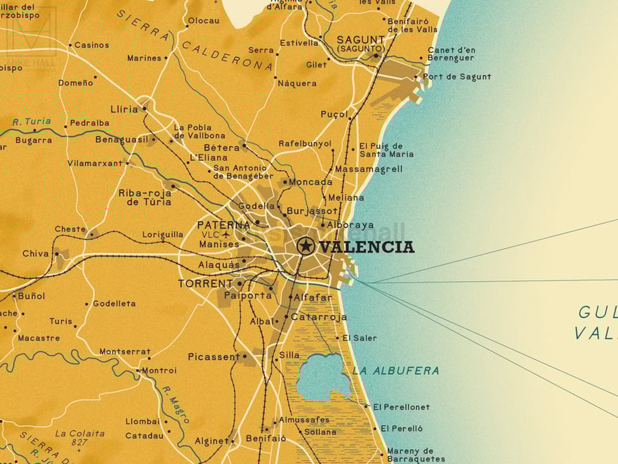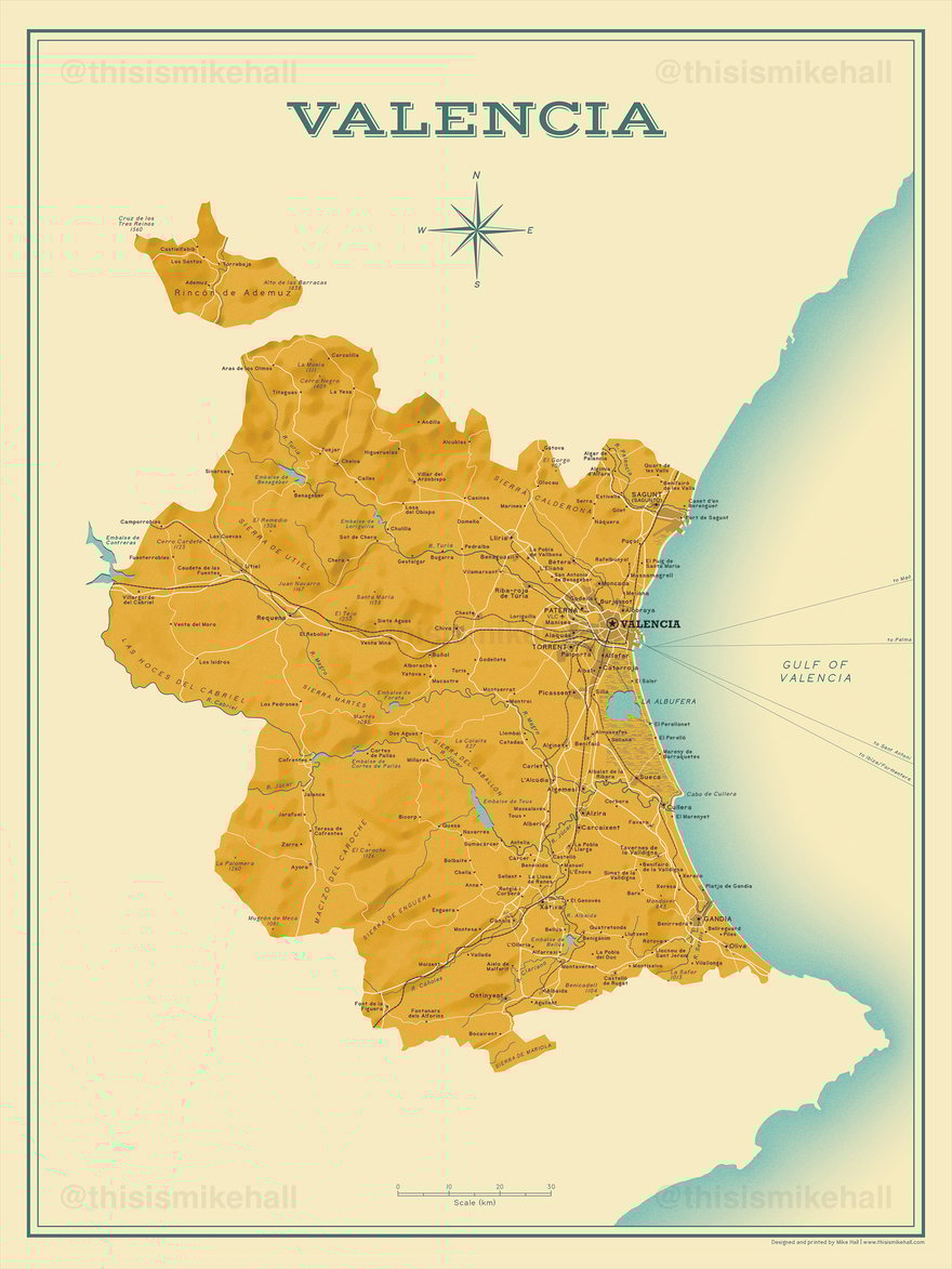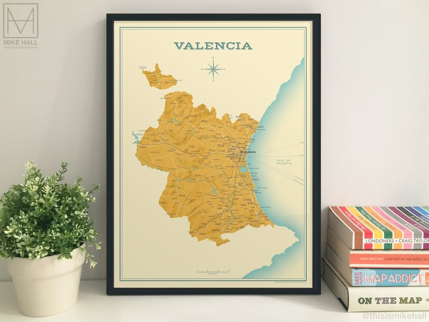 Detail from the English version of the Valencia map, using exonyms for place names and natural features. The primary typeface used throughout is Bell Topo Sans; Rockwell Bold is used for the provincial capitals.