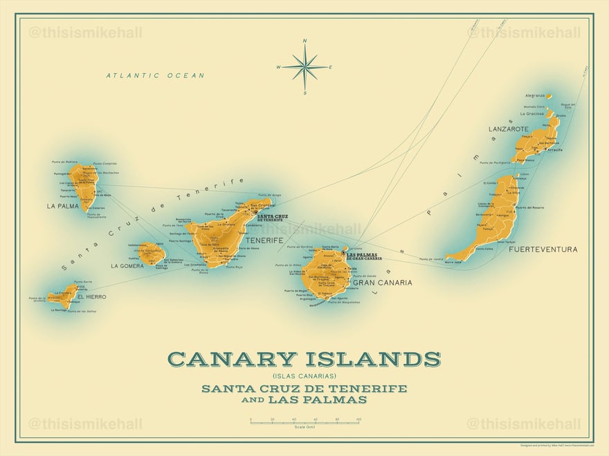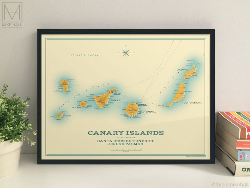 The map of the Canary Islands, an overseas territory of Spain located off the west coast of Africa divided into two provinces: Santa Cruz de Tenerife and Las Palmas. This is the only design that displays more than one province in a single map.