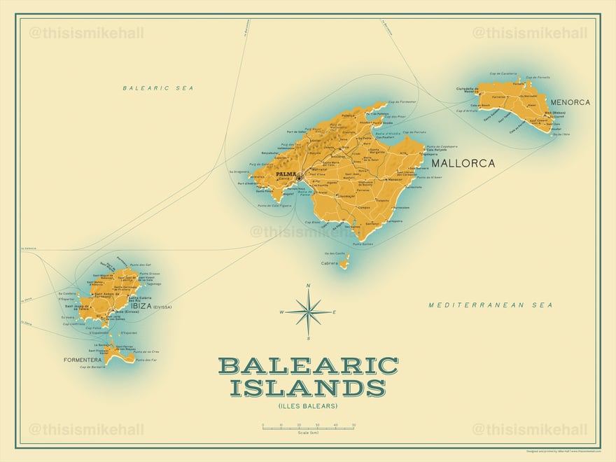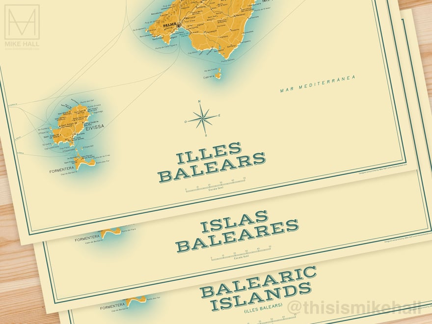 An example of the various versions of a map in different languages, in this case the Balearic Islands map which comes in three versions: international (English exonyms), Spanish and Catalan (Balearic). Each version uses correct place name and title spellings for each language.