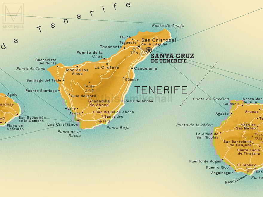 A detail from the Canary Islands map. The minimal colour palette is intended to evoke a bright, warm climate and memories of summer holidays. A light grain effect, terrain shading and the slightly offset positioning of the sea colour in relation to the coastline enhance the period feel.
