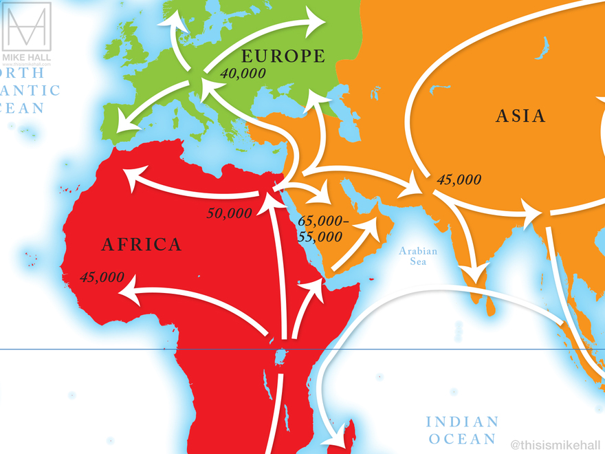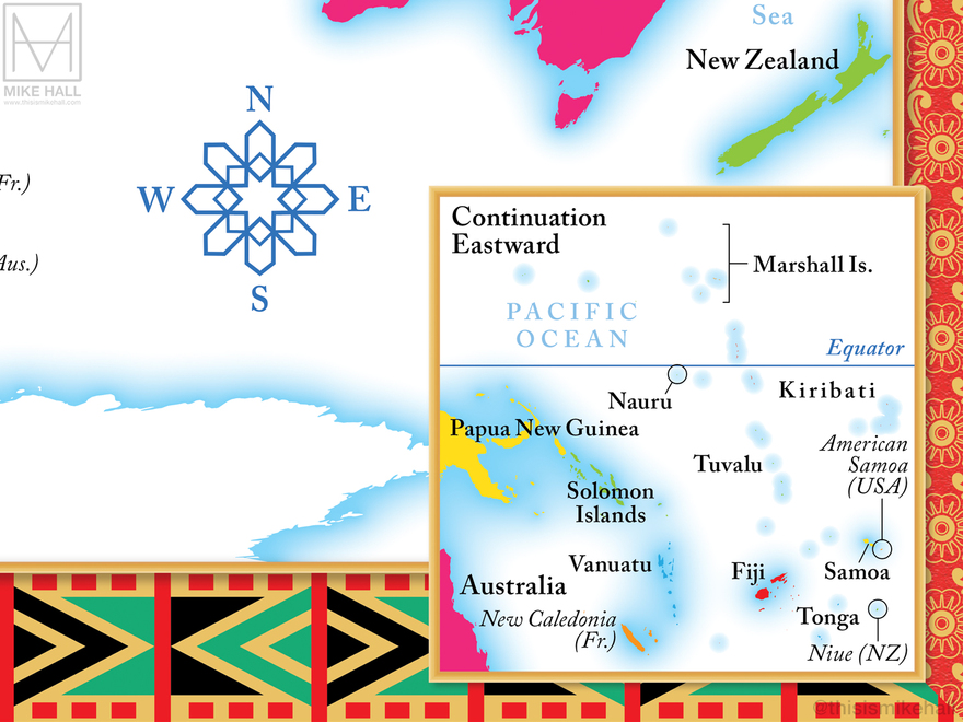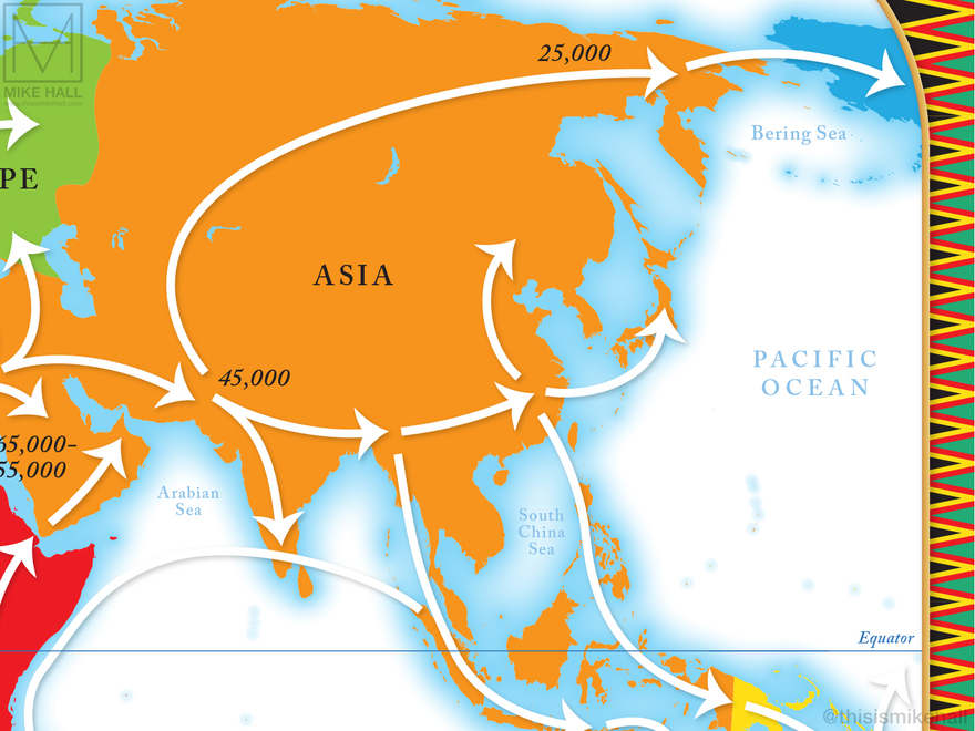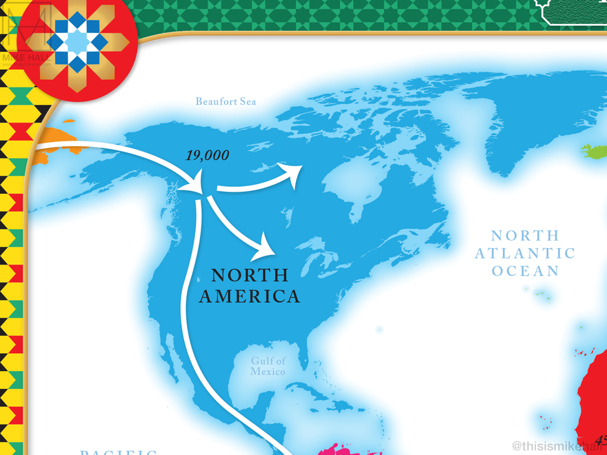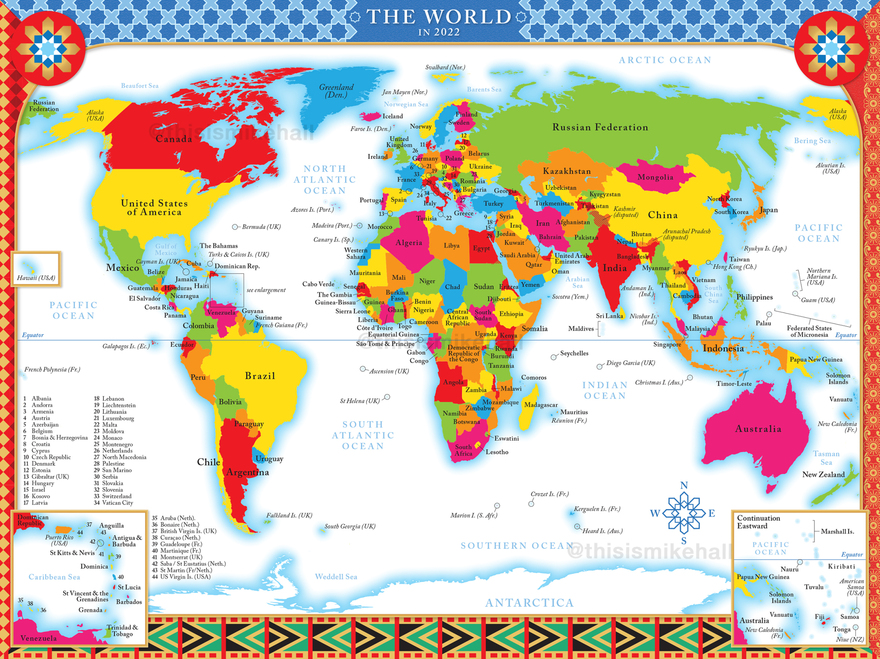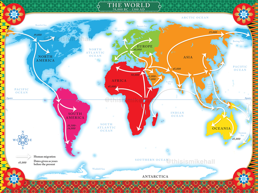 This pair of colourful maps were designed for the endpapers of the historian Simon Sebag Montefiore's new book on human history The World: A Family History (Orion Books, 2022). Their style, colour scheme and decoration were designed to match the multicoloured, geometric patterns of the book's cover. Both maps use the same identical projection and composition, with differing details. The first highlights the seven continents and the patterns of early human migration from Africa across the rest of the globe up to c.14,000 years ago, while the second is a political map of the world that labels every country and major territory as of 2022.