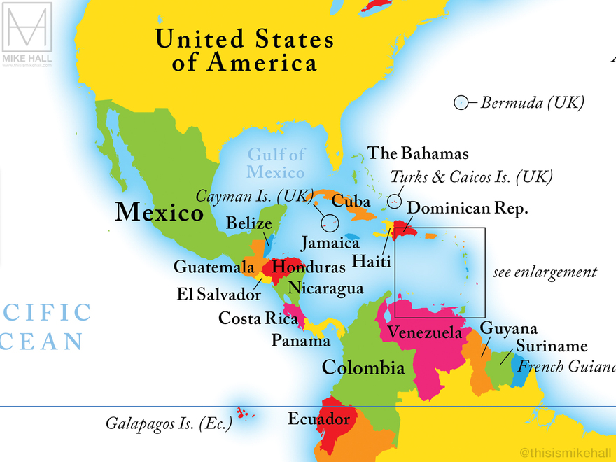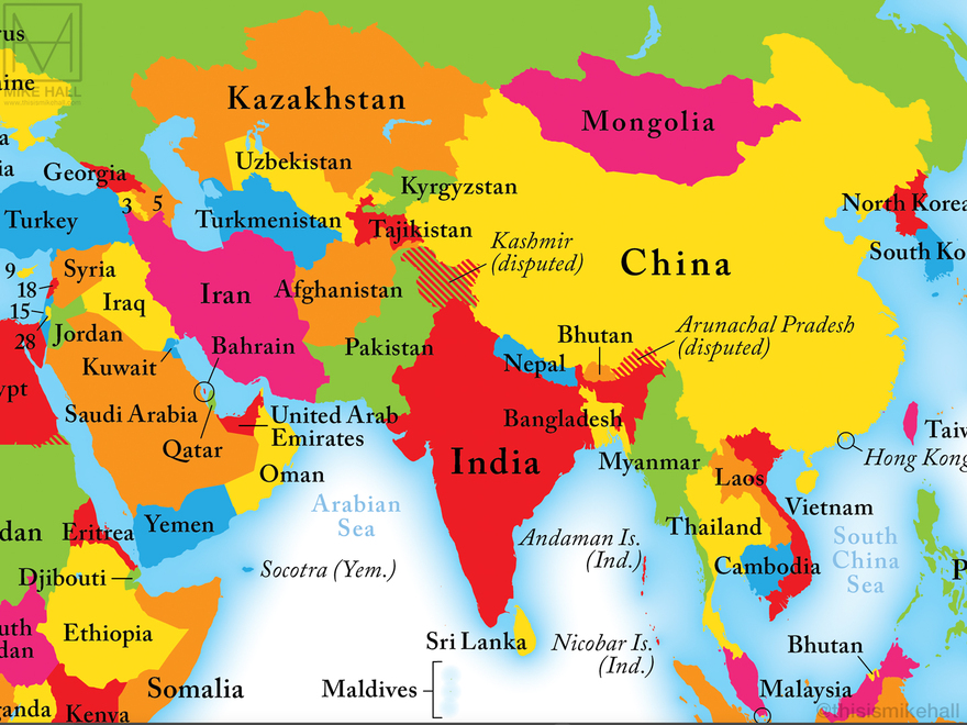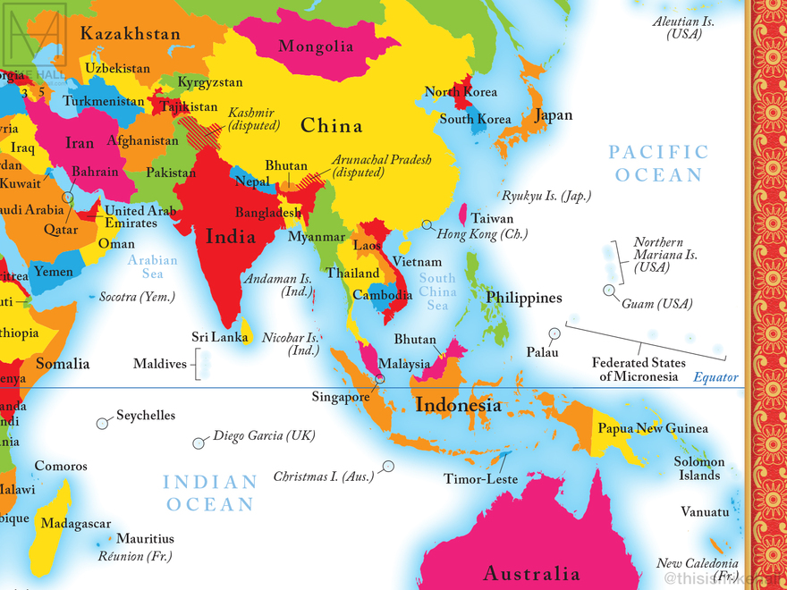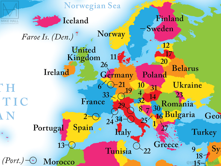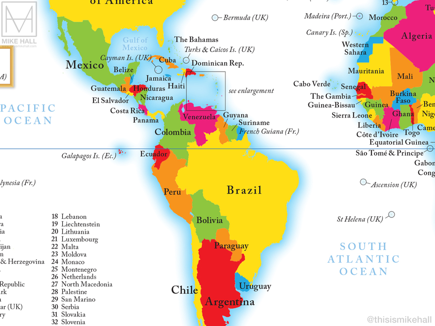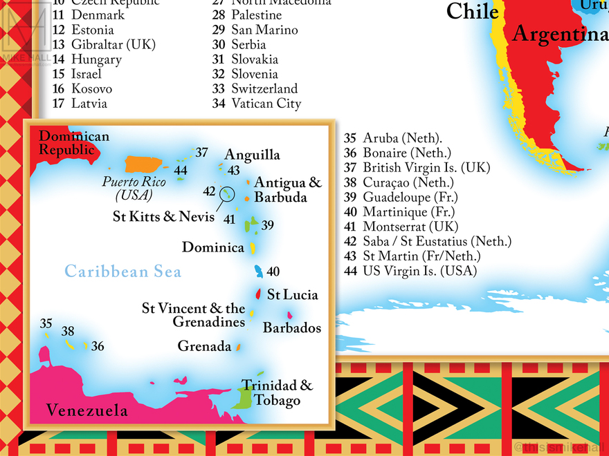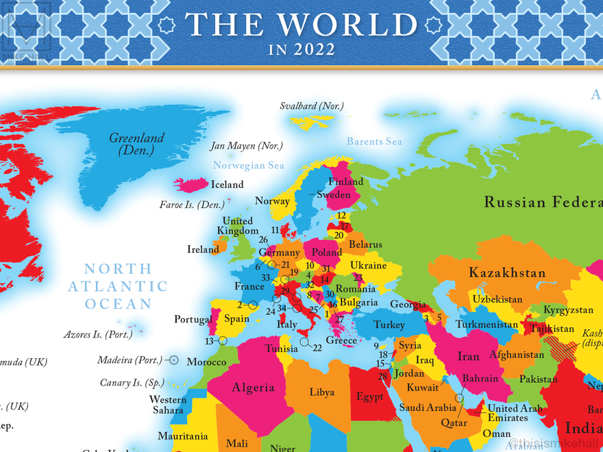 The small size of the spread (286 x 214 mm) presented a challenge when placing labels in parts of the world where there are many small countries and territories, such as Europe. The smallest countries are labelled with numbers that corresponding to the index at the bottom left corner.
