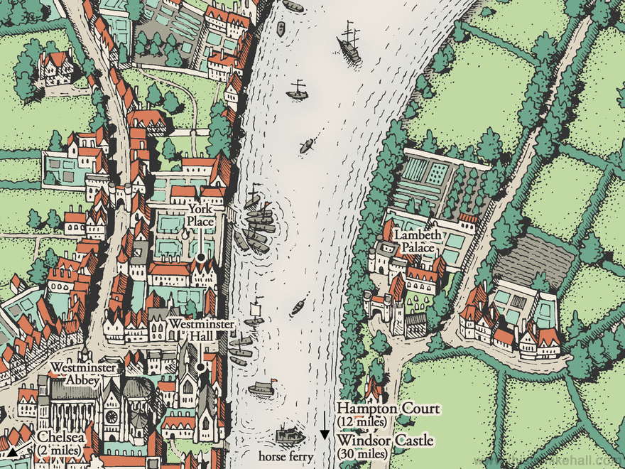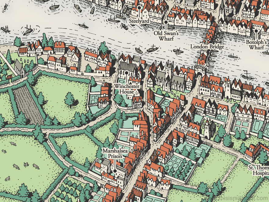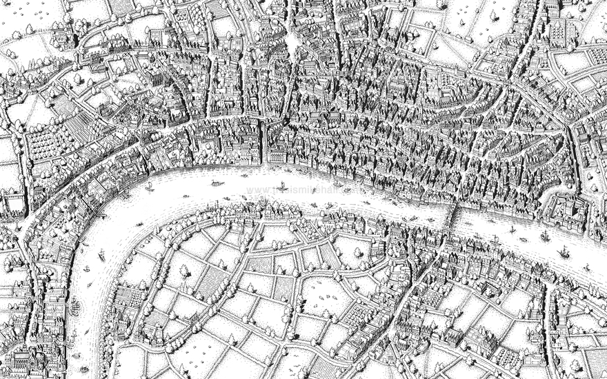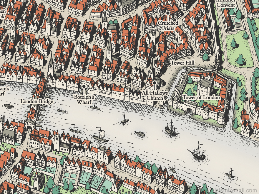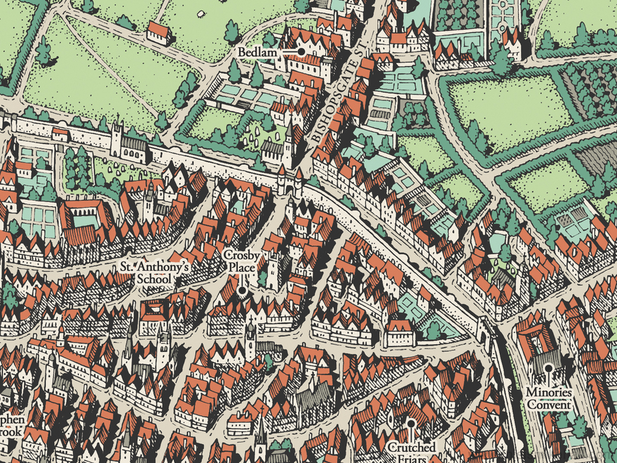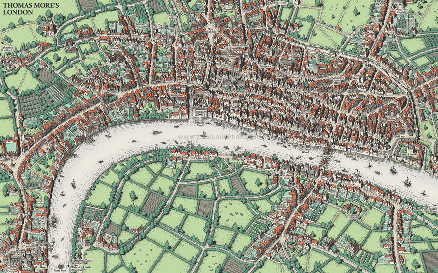 The first part of the commission involved the creation of this detailed historical view of London during Thomas More's lifetime (1478-1535), loosely based on the appearance of the city and its streets and buildings in the 16th century (click to enlarge).
