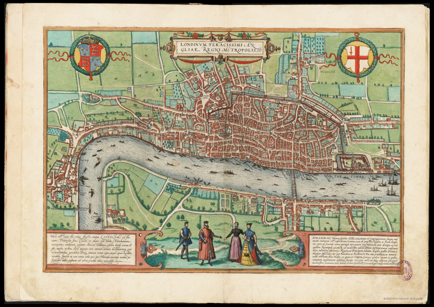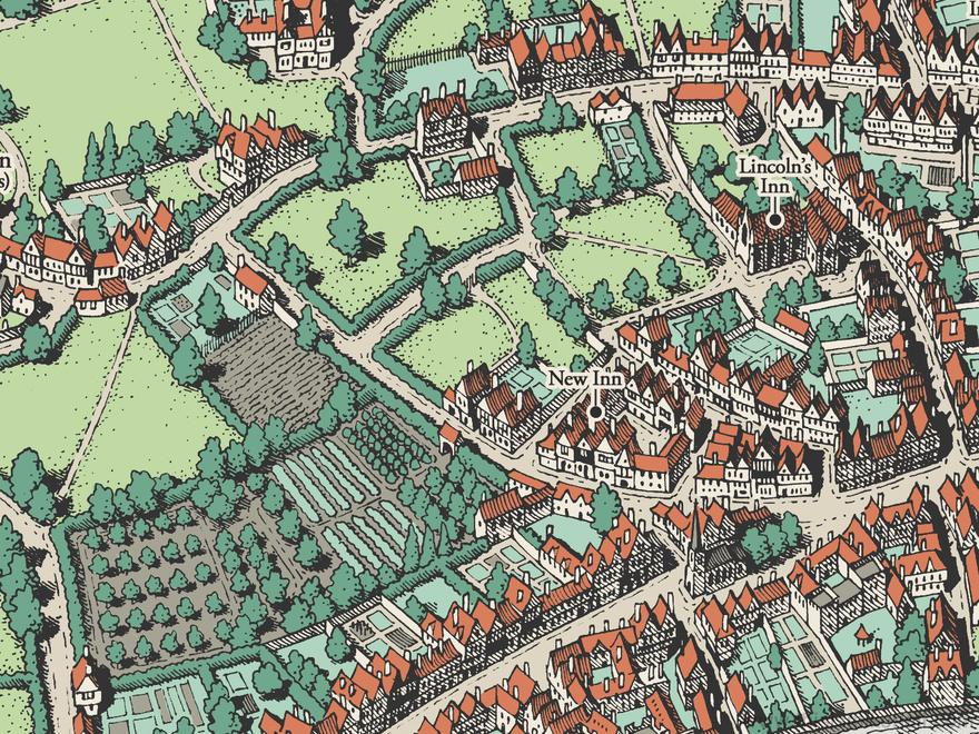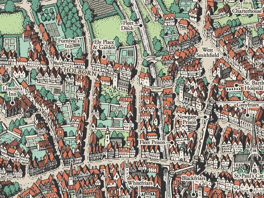 A view of London from Georg Braun and Frans Hogenberg's Civitates Orbis Terrarum (Cities of The World) of 1617, which inspired my map's style, composition and colour scheme.