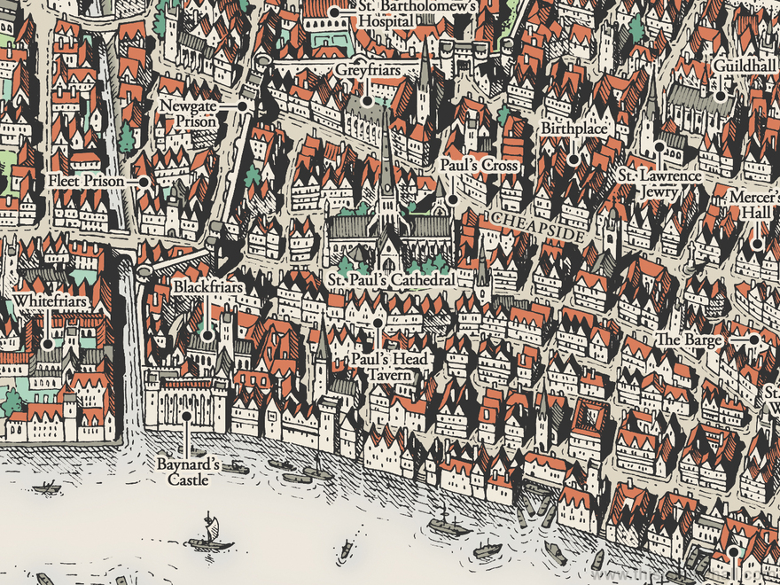 Detail of St. Paul's Cathedral, Blackfriars and Cheapside. Thomas More's birthplace at Milk Street is marked at the top right.