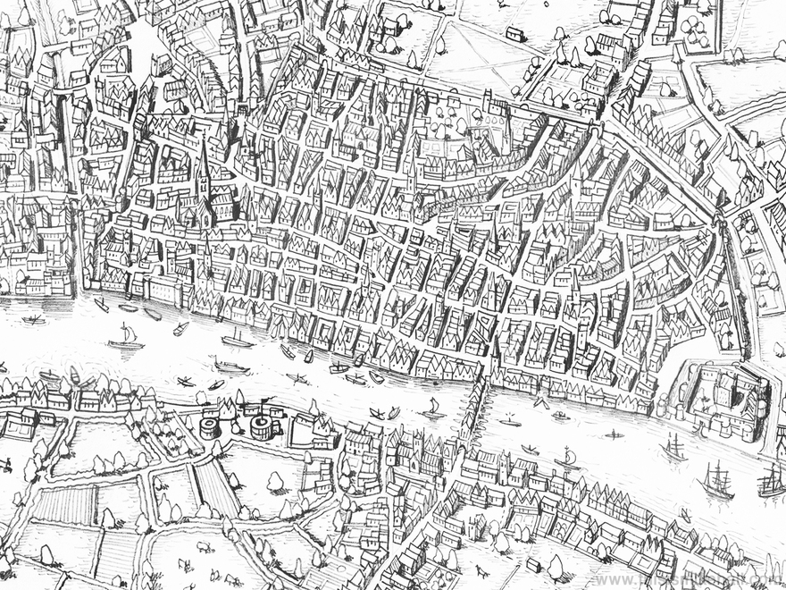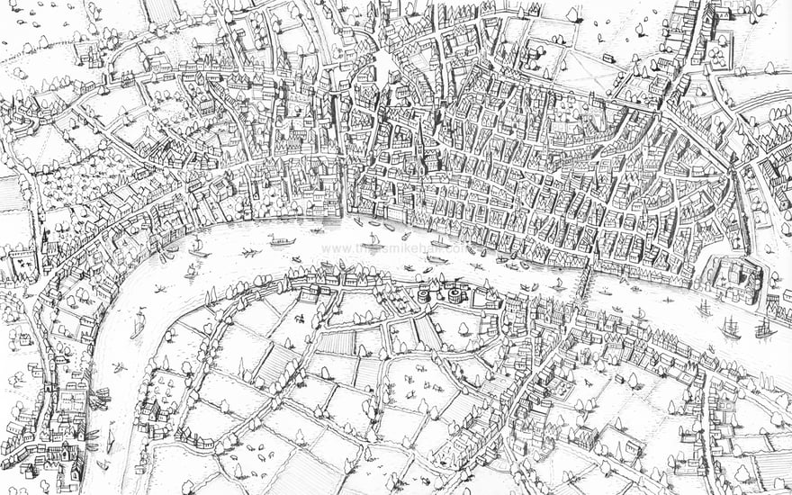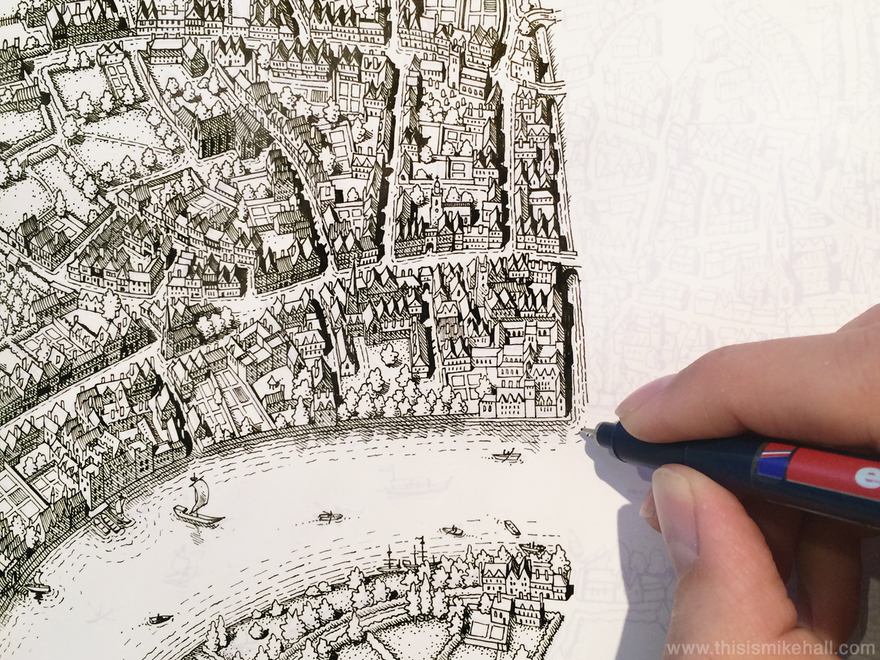 Completed ink version of More's London map (click to enlarge). Colours and text were subsequently added using Photoshop.