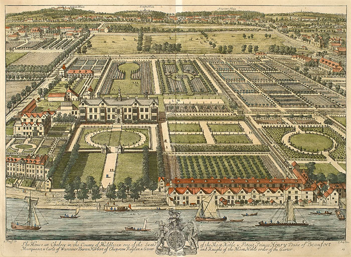 The house was demolished in 1740 (a full history of the site can be read here: https://www.british-history.ac.uk/survey-london/vol4/pt2/pp18-27). Modern-day Beaufort Street now runs north-south directly through the middle of the site, following the line of the mansion's main driveway; Chelsea Old Church, shown at the bottom-right corner of the drawing, still exists beside the river today.
