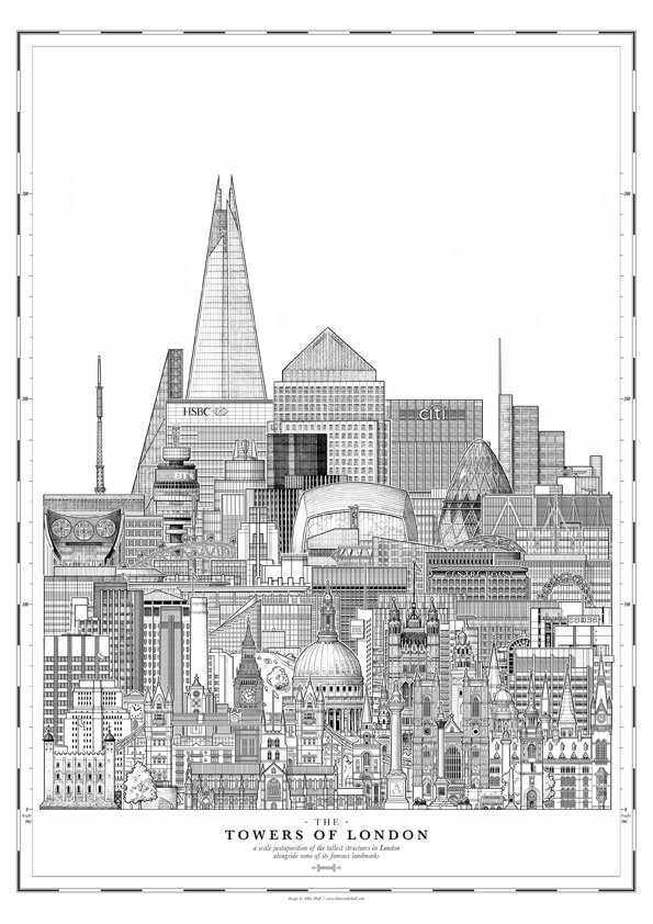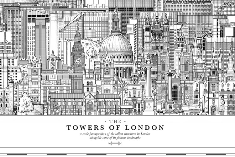 'The Towers of London' is a diagrammatic view of the tallest buildings and structures in London, as well as some other famous landmarks, juxtaposed beside each other to compare their
