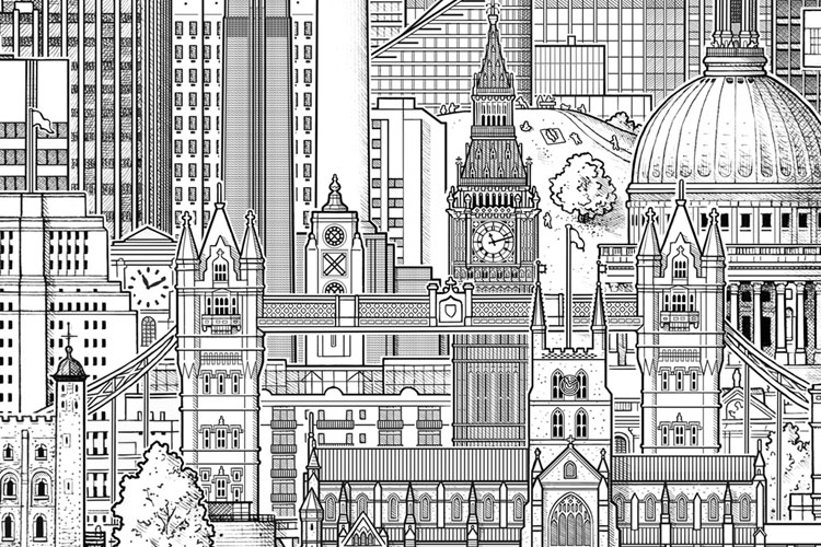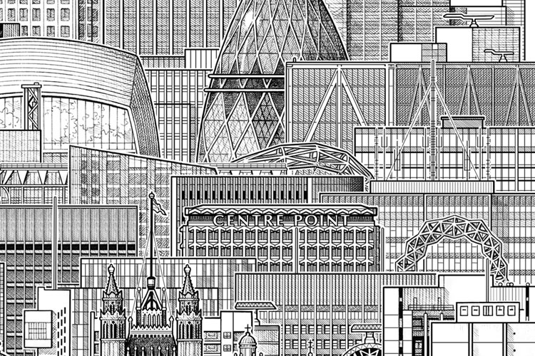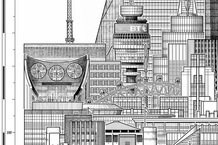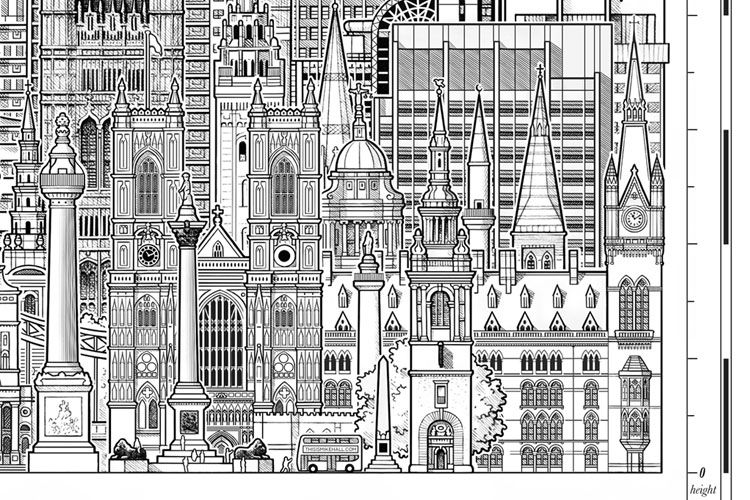 There are 76 buildings and structures featured altogether, alongside Primrose Hill and a London bus. The tallest buildings include the Shard, Canary Wharf, Heron Tower, Tower 42, The Gherkin, BT Tower, the Walkie Talkie and Crystal Palace transmitter; other buildings include St. Paul’s Cathedral, Tate Modern, the London Eye, Houses of Parliament, St. Pancras Station and Tower Bridge. The print includes an insert which lists the details (height, date of completion and architects) of all the buildings featured.