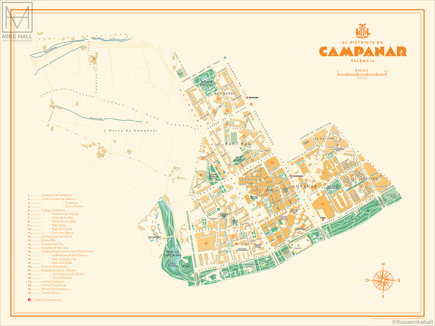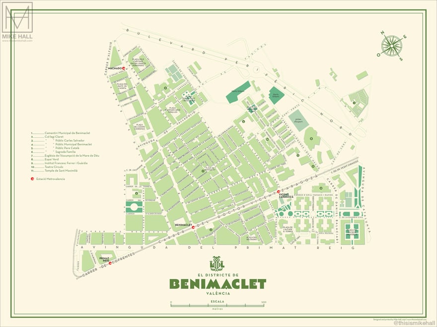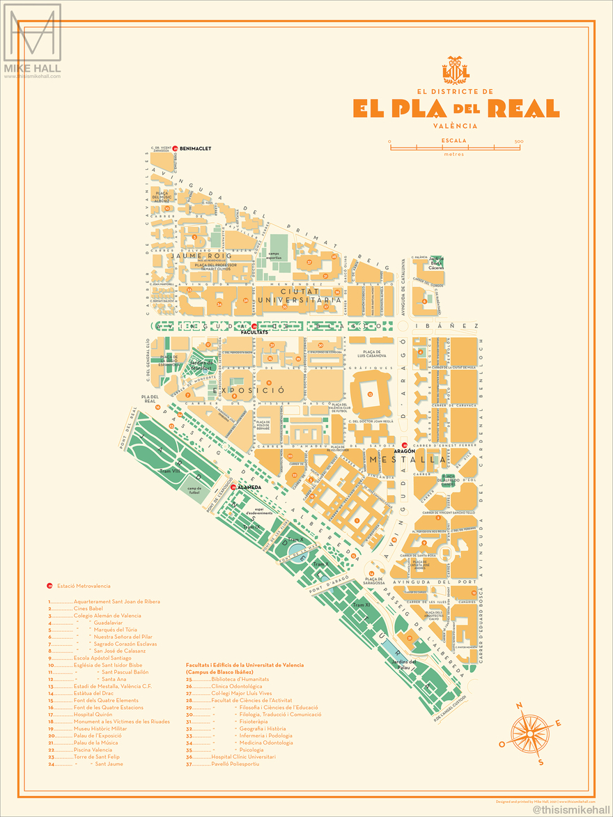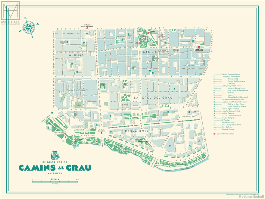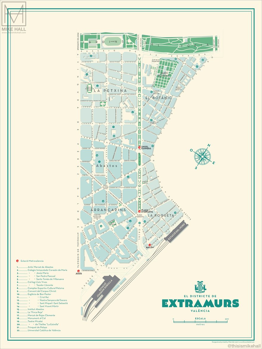 Prints of these designs are available from https://shop.thisismikehall.com/collections/distritos-de-valencia