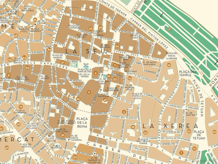 My map of Ciutat Vella, the historic centre of the city, displays the courses of the ancient city walls of the Roman and medieval periods.